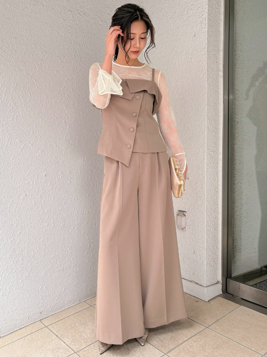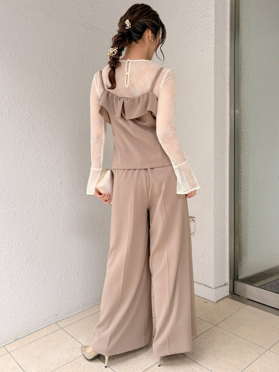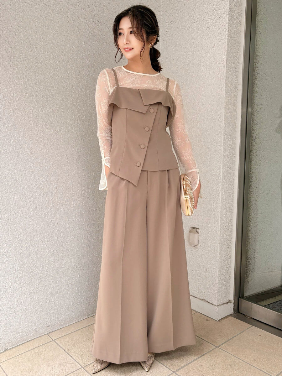 ◇商品について:ベージュのセットアップドレス。インナーはアイボリーのレースをセット。セパレイトタイプなので楽に一日過ごせます。ワイドパンツで履き心地もよくウエストはゴムが採用されています。ベルトが通せるパンツなのでサイズ合わせも可能。トップスはアジャスター付きで肩紐の調整ができ背部はゴムになっています。レースのインナーは透けるので下着は気を付けて頂きたいですがデザイン性もありおしゃれに楽に着こなせるパンツドレスです。