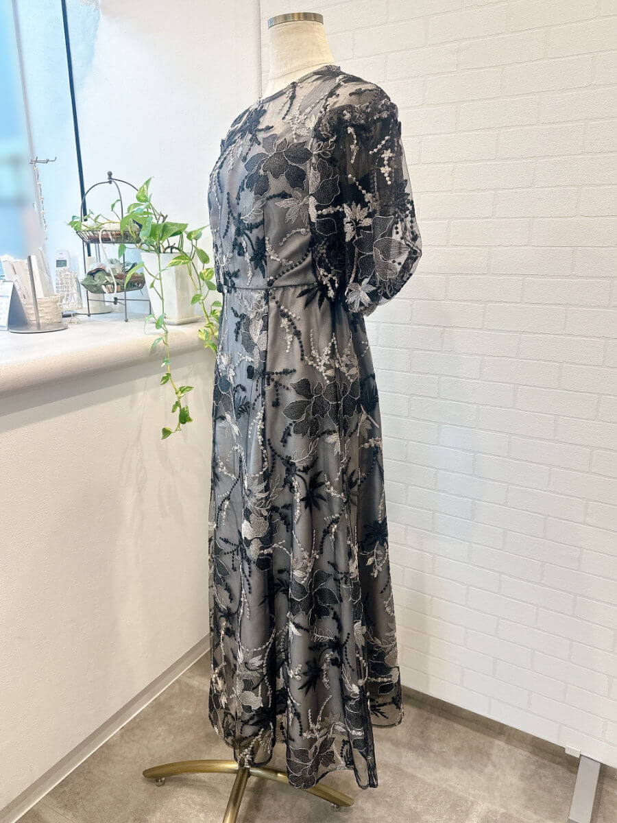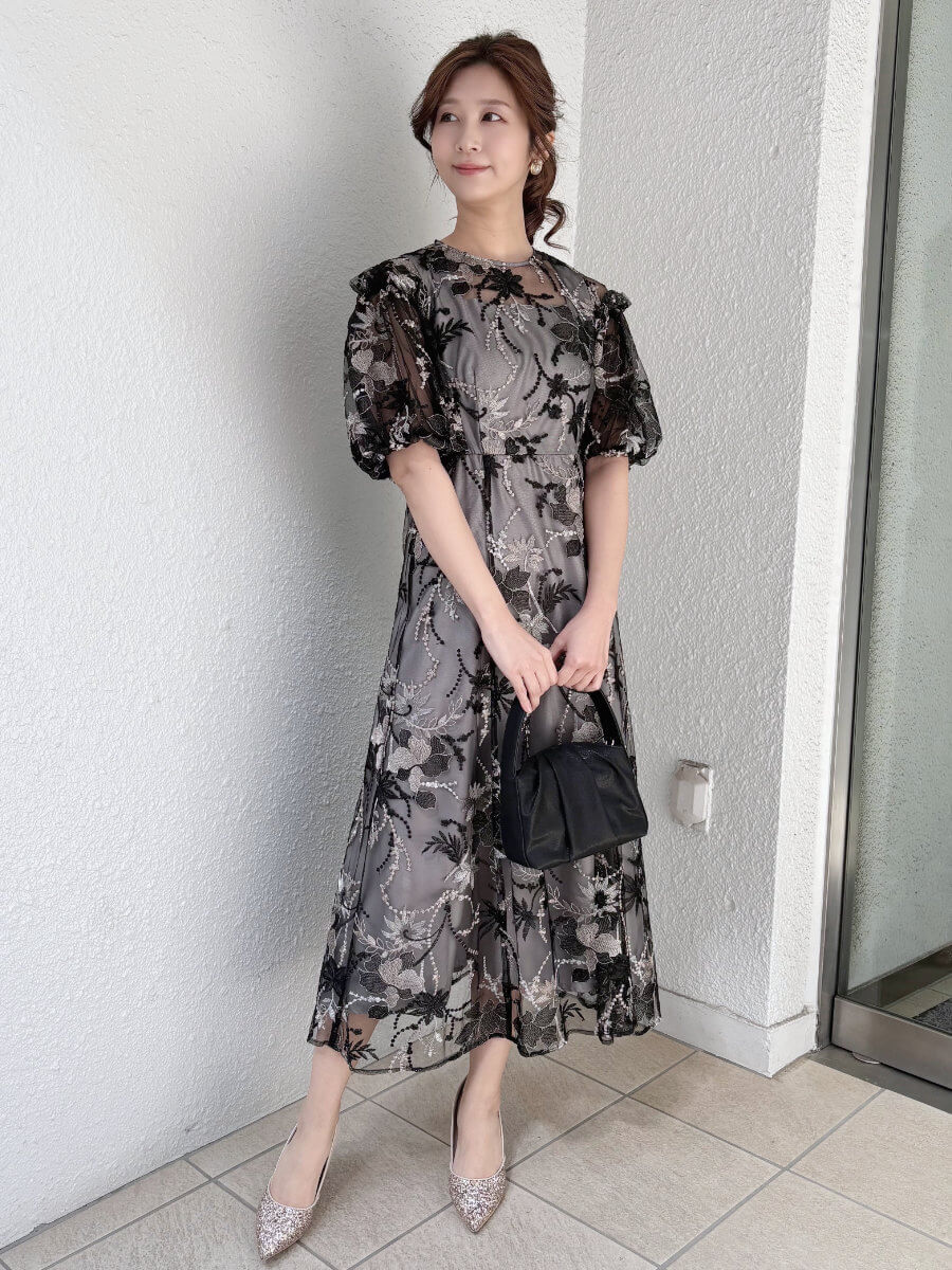 ◇商品について:総レースのパフスリーブドレス。袖部分はゴムなので二の腕部分が不安な方も安心して着用できる設計。ウエスト背部もゴム使用で楽ちんな着心地。肩紐部分は太目なので下着も気にせずに着用できます。上品で華やかな刺繍なので幅広い年齢層の方に着用して頂けます。ブラックとシルバーの刺繍が施されていてブラックだからこそシルバーが映えるので華やかになります。