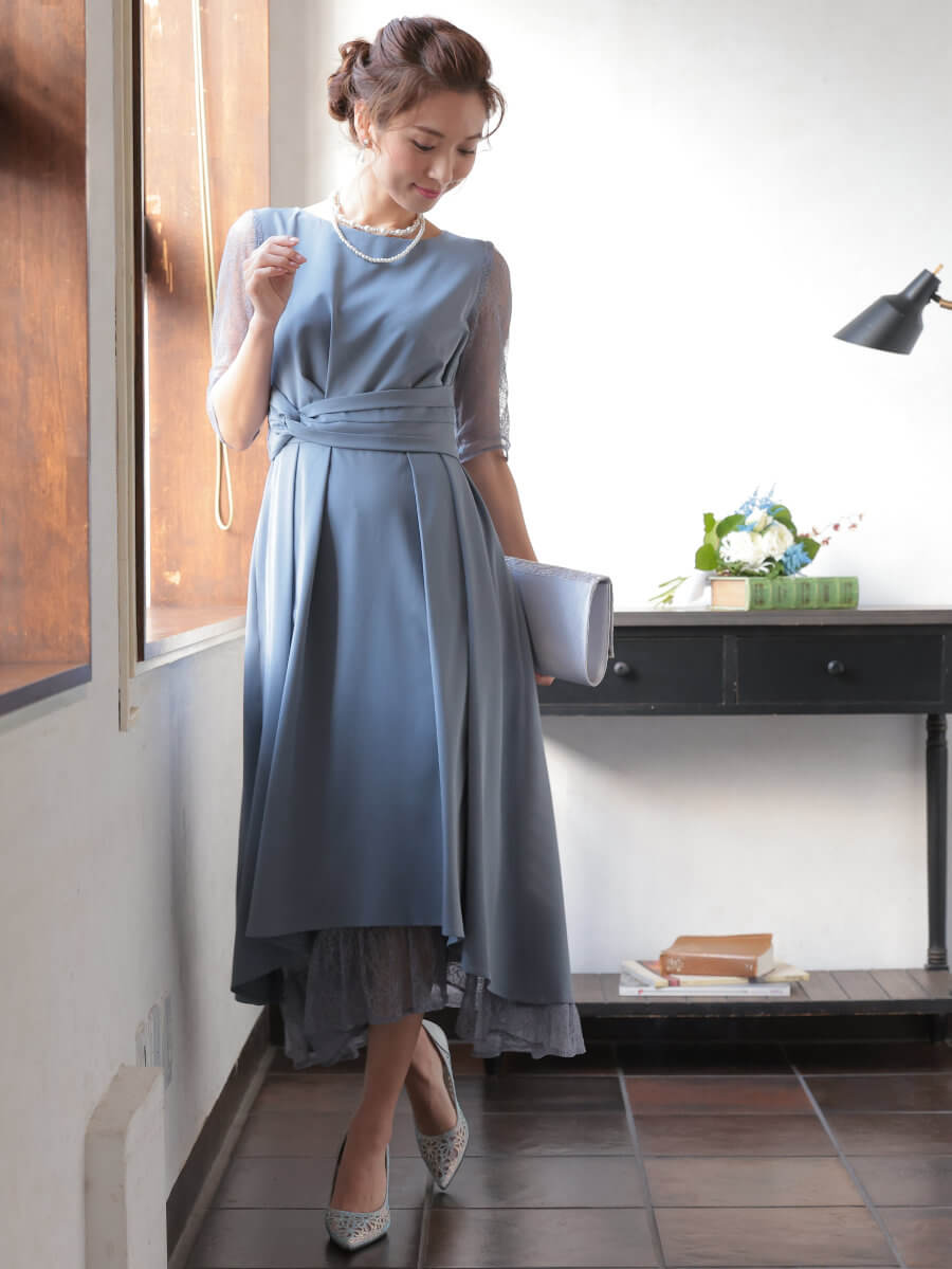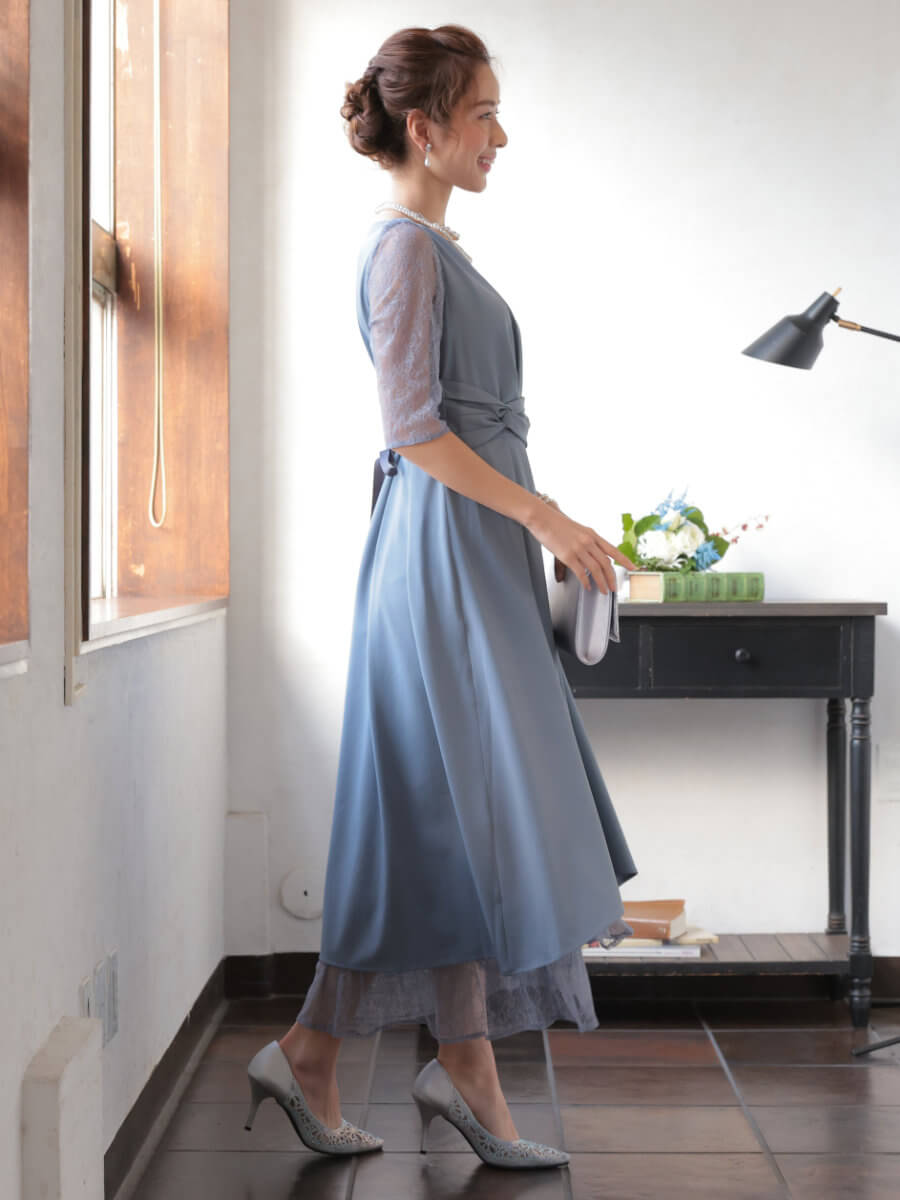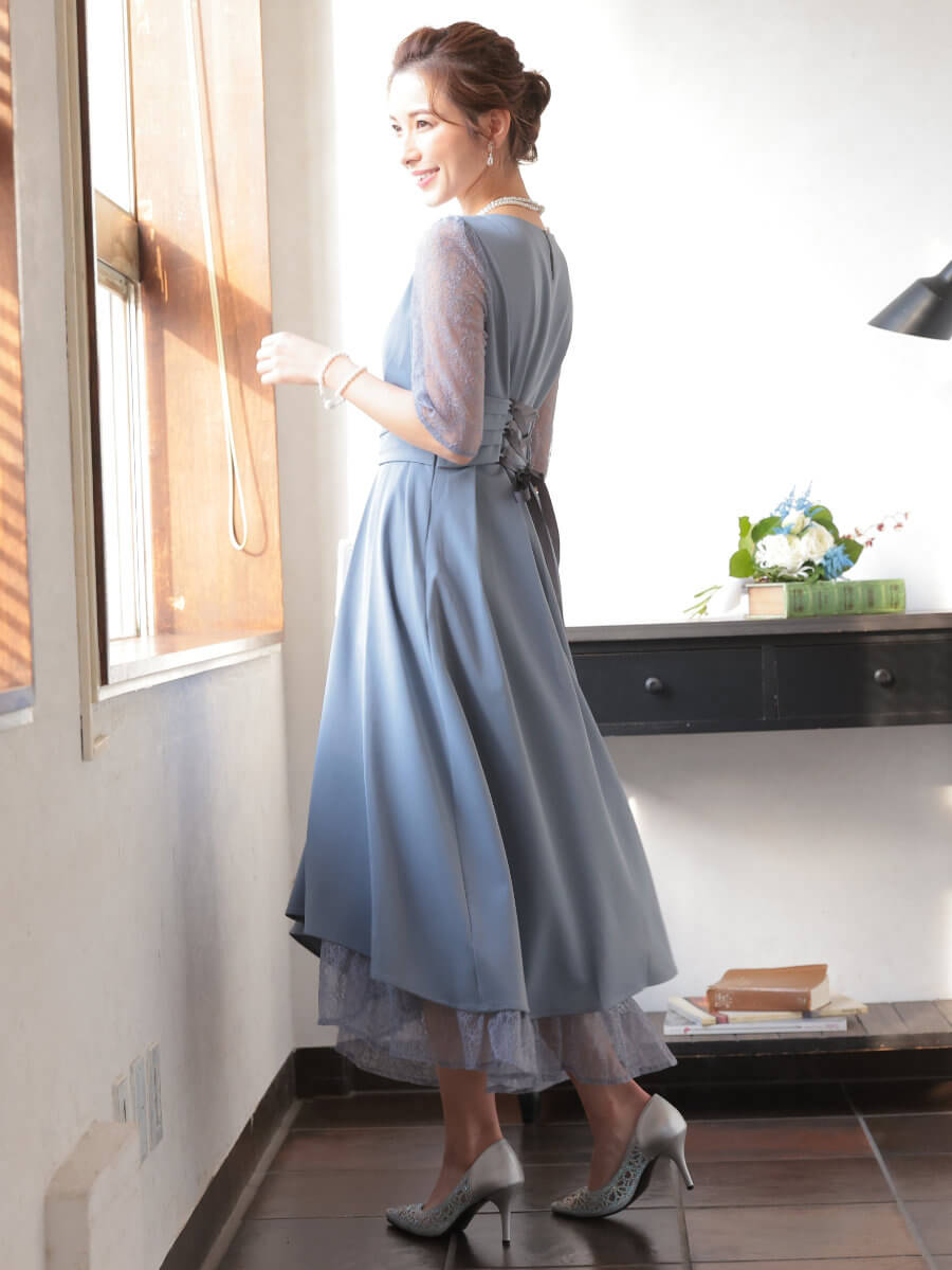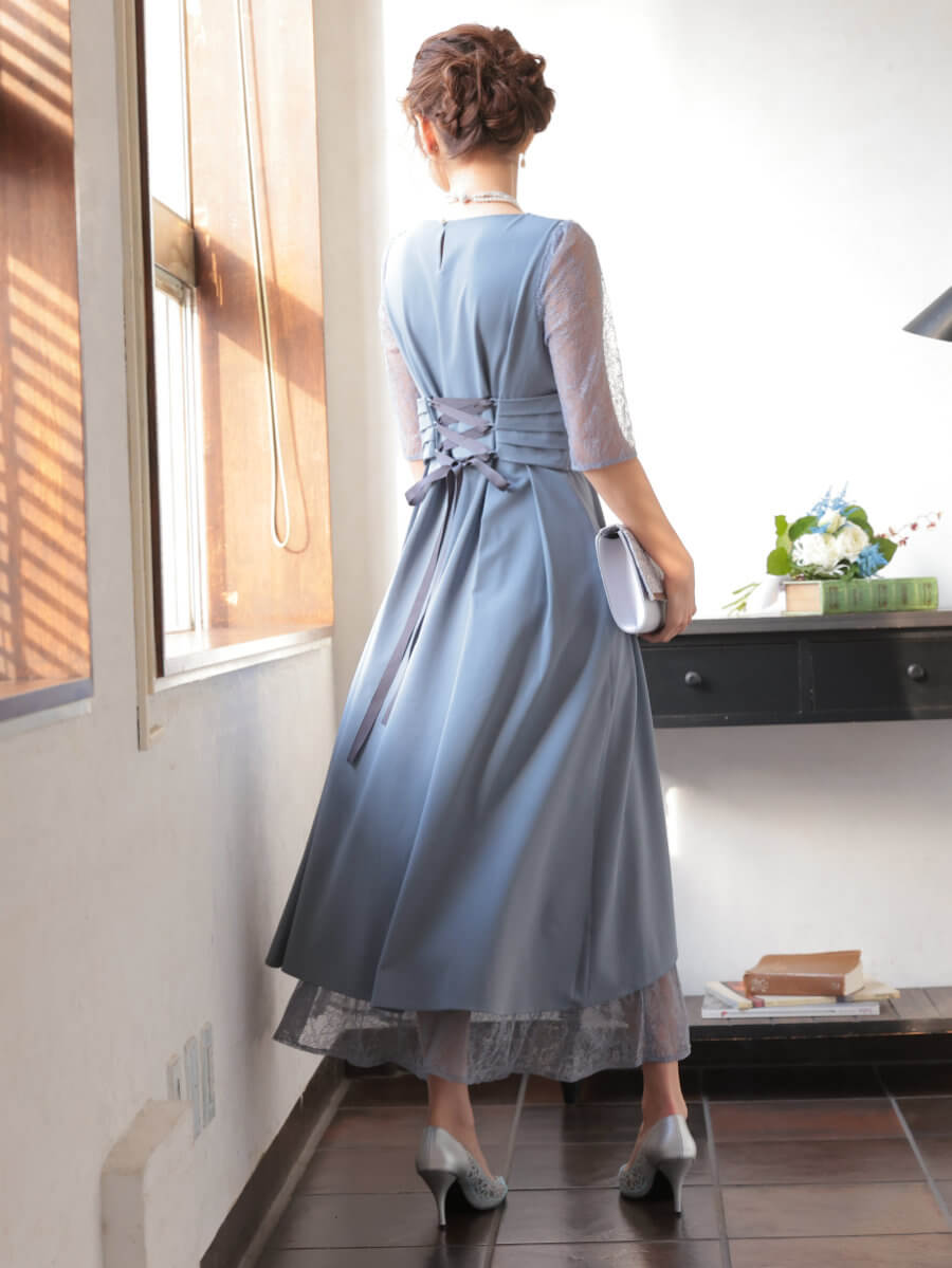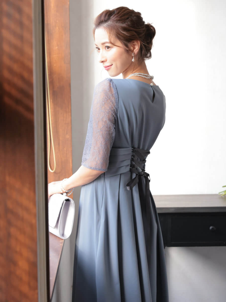◇商品について:光沢感のある生地にレースのインナーがレイヤード。フィッシュテールのデザインで横からの姿も美しいドレスです。ウエストは太目のラインで絞られておりレースアップドレスなのでおサイズ調整もできるため、ご自身の体型に合わせて着れるドレスです。定番ドレスとして様々なシーンでご着用できます。