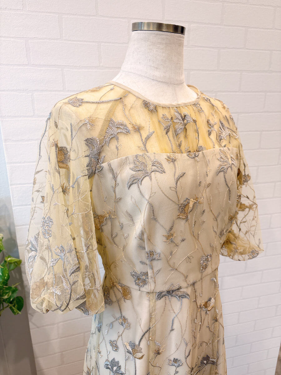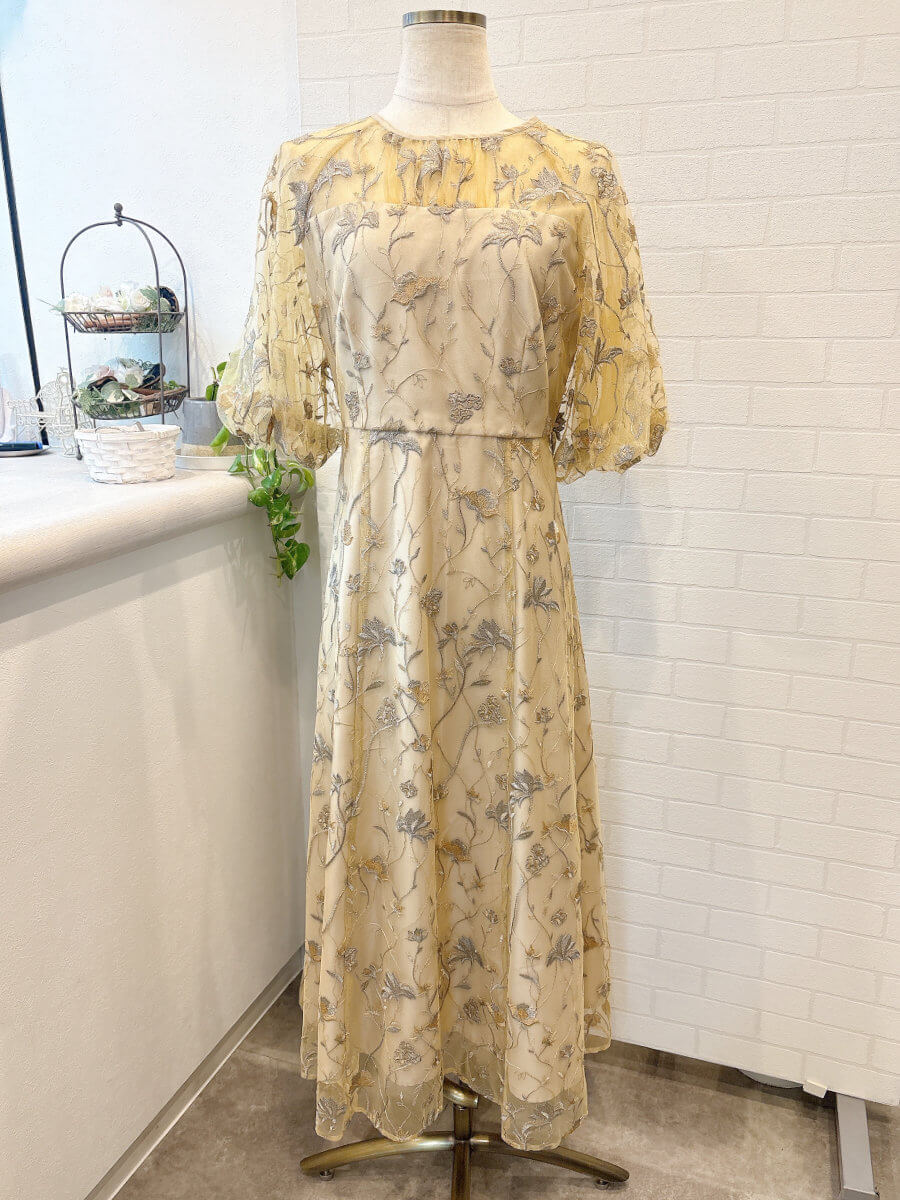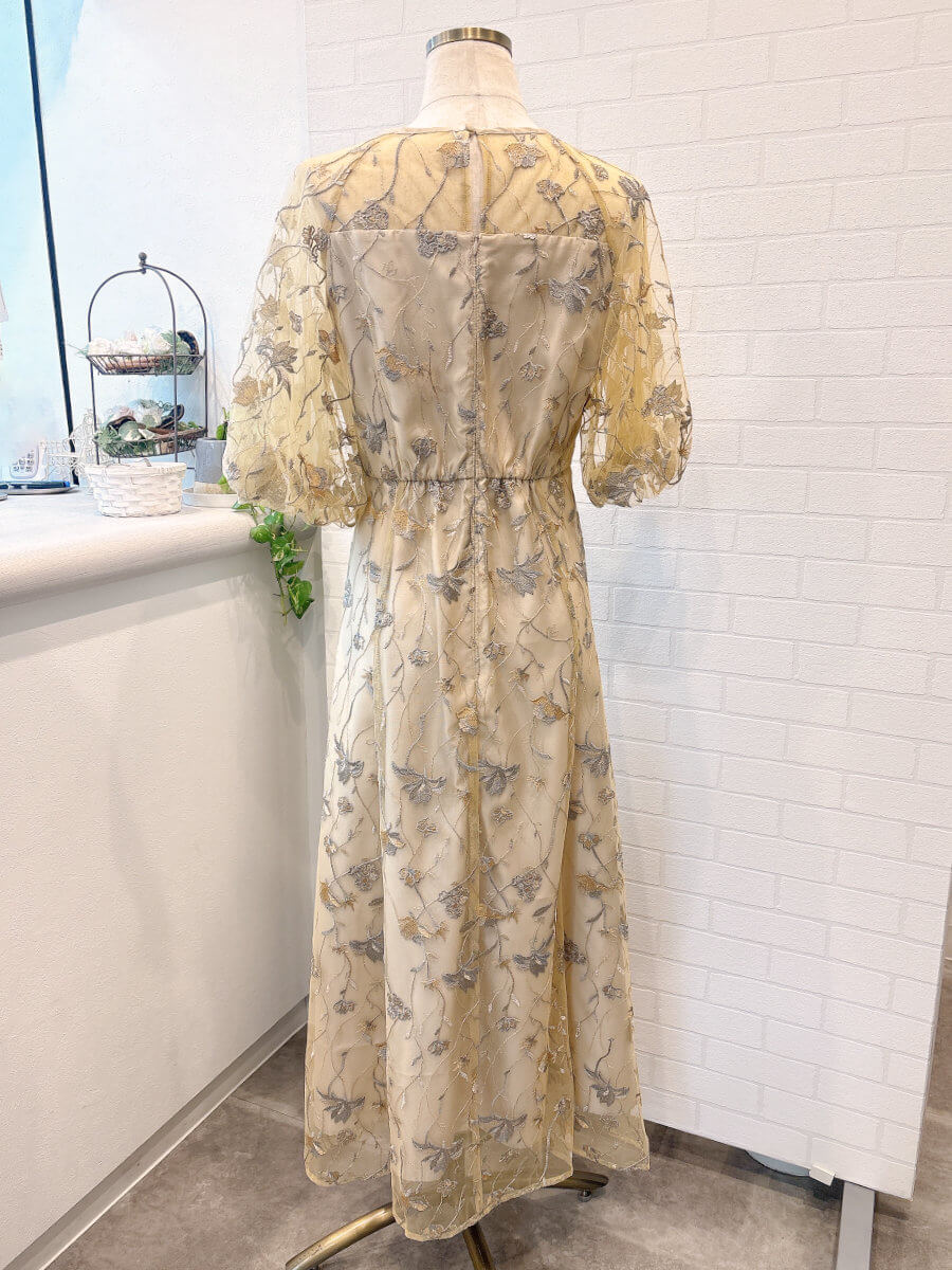 ◇商品について:繊細なフラワー刺繍を全面にあしらった気品あふれるドレスです。透け感のあるチュール素材が軽やかで女性らしい印象を演出します。落ち着いたニュアンスカラーが甘さを抑え結婚式やパーティだけでなくお食事会など幅広いシーンに対応します。ウエストはゴムが採用されておりサイズ調整が可能です。