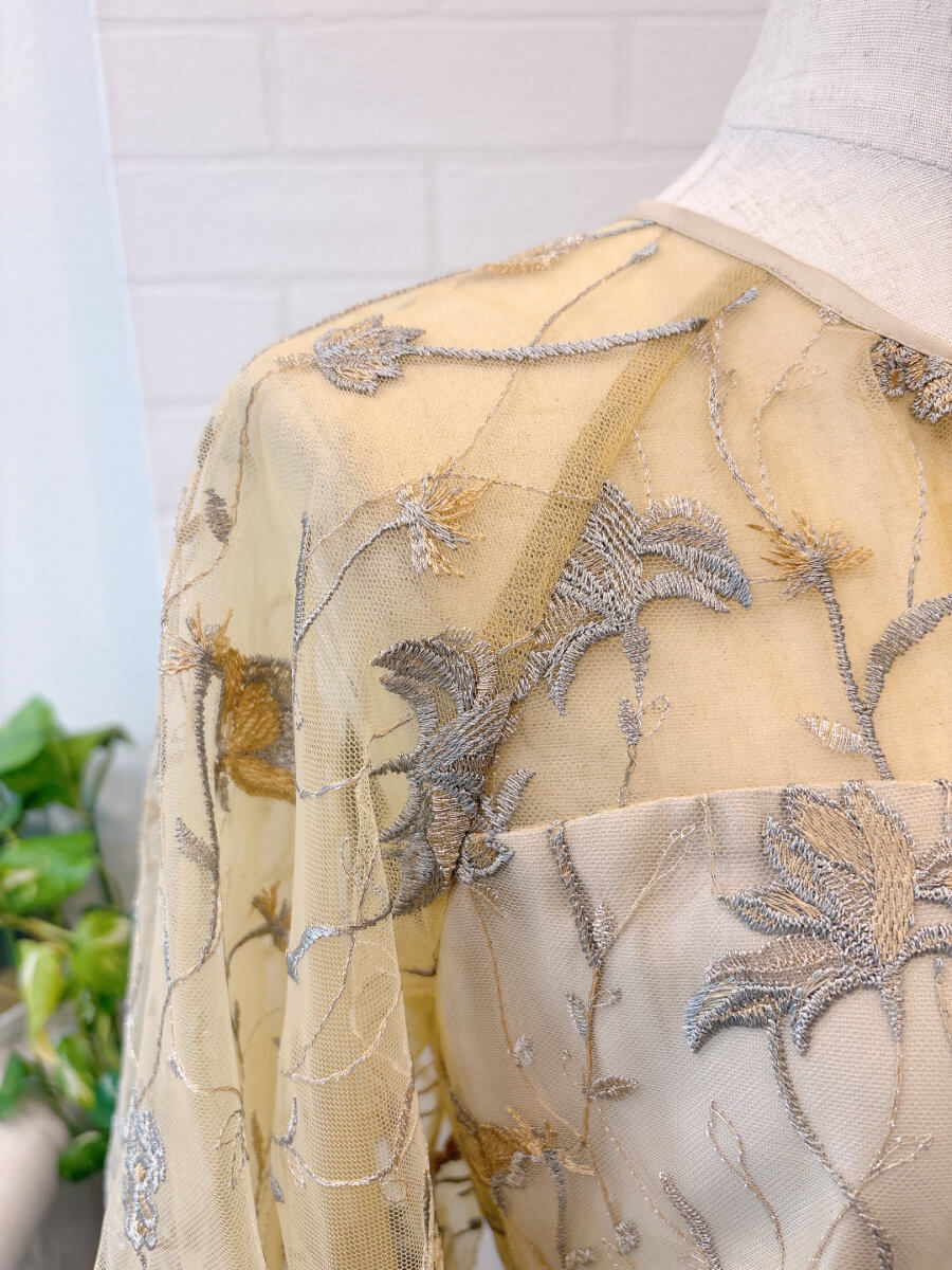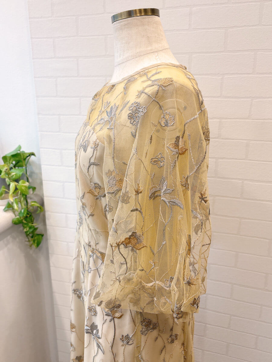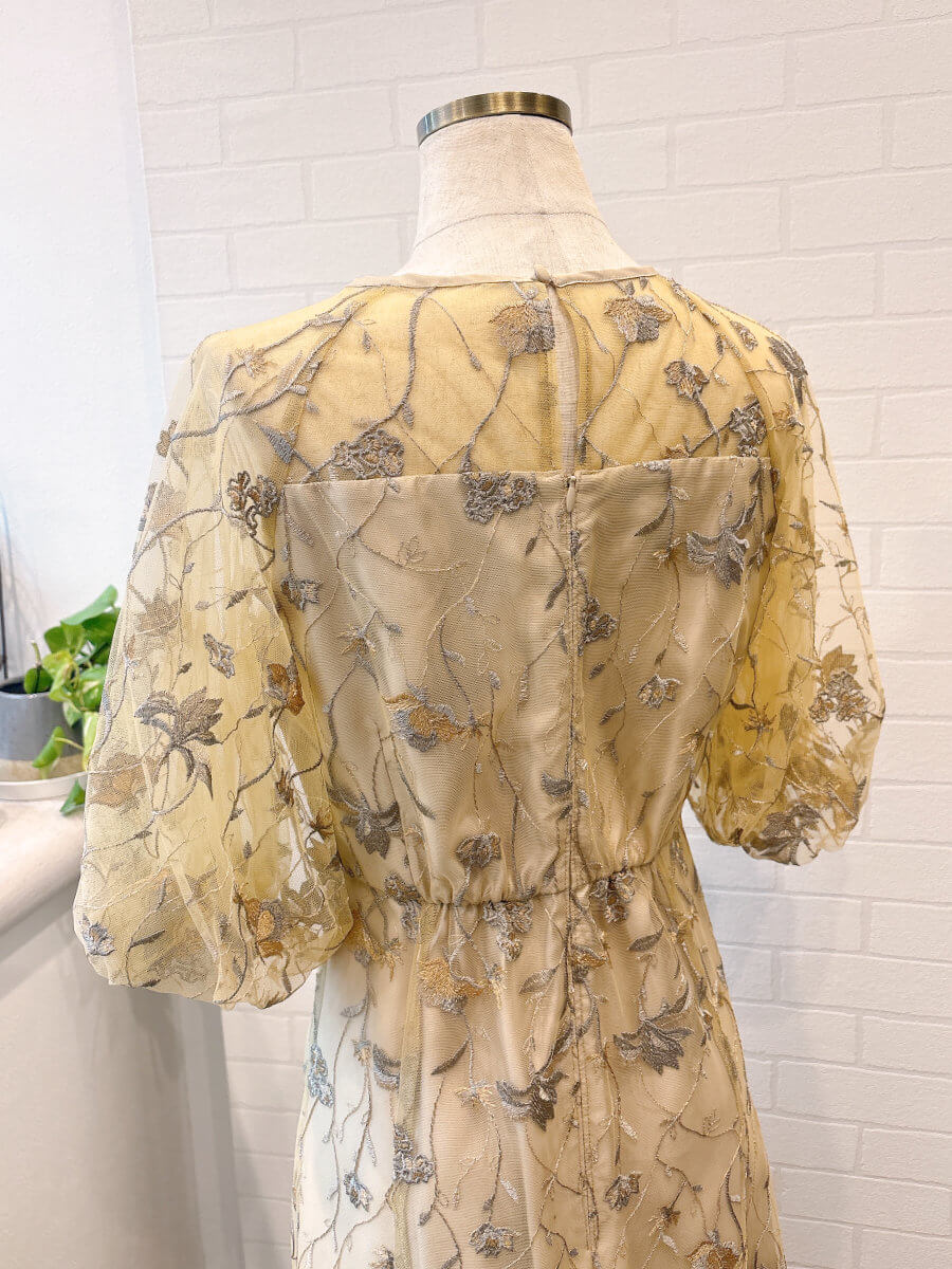 ◇商品について:繊細なフラワー刺繍を全面にあしらった気品あふれるドレスです。透け感のあるチュール素材が軽やかで女性らしい印象を演出します。落ち着いたニュアンスカラーが甘さを抑え結婚式やパーティだけでなくお食事会など幅広いシーンに対応します。ウエストはゴムが採用されておりサイズ調整が可能です。