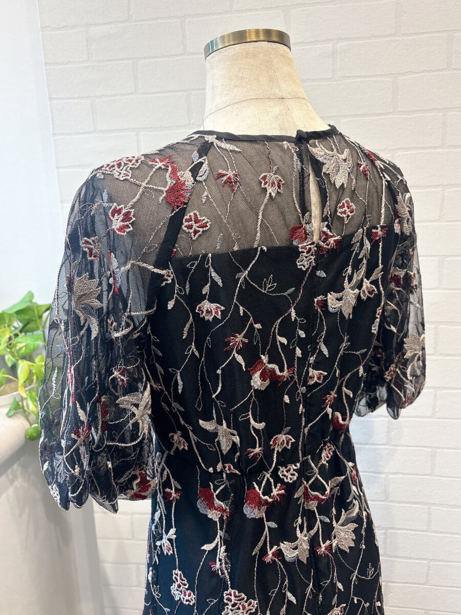 ◇商品について:繊細なフラワー刺繍を全体に施した上品なドレスです。落ち着いたダークトーンに程よい透け感のある袖とデコルテが軽やかさを添えて華やかさと品の良さを両立。ウエスト切り返しですっきりしたシルエットで結婚式、パーティ、お食事会など幅広いシーンで活躍するドレスです。ブラックに赤、ブルー、シルバーの個性のある刺繍がレトロ感もあり大人なドレスです。