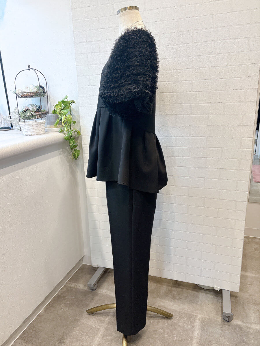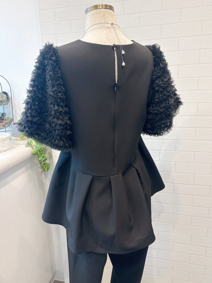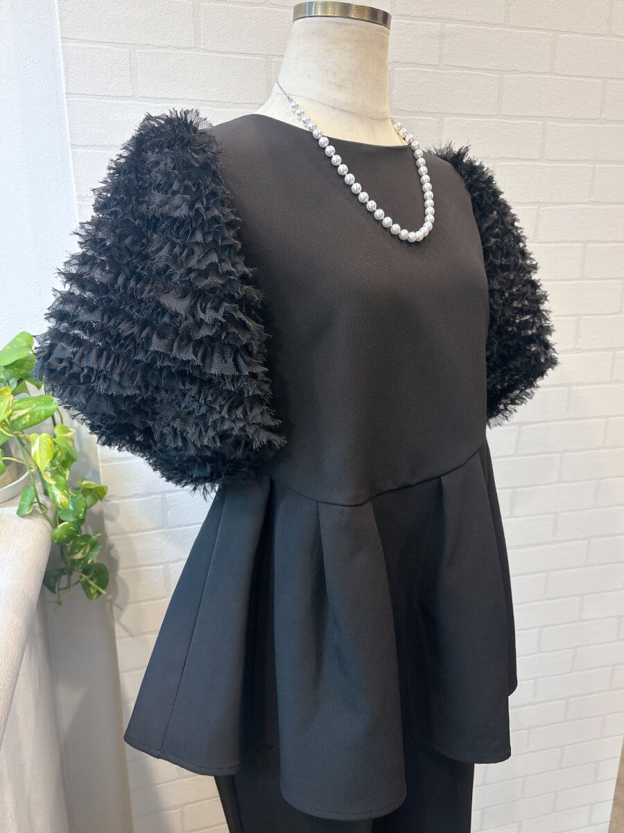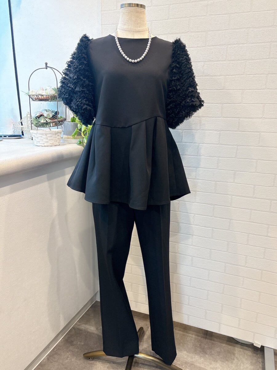 ◇商品について:ブラックのセットアップパンツドレスです。チュールのボリューム袖とアシンメトリ―なペプラムのトップスがシンプルなパンツを上品に華やかに。パンツはスッキリしたシルエットでトップスとのメリハリがあります。結婚式だけでなくパーティやお食事会、会社のセレモニーなど幅広くご利用頂けます。
