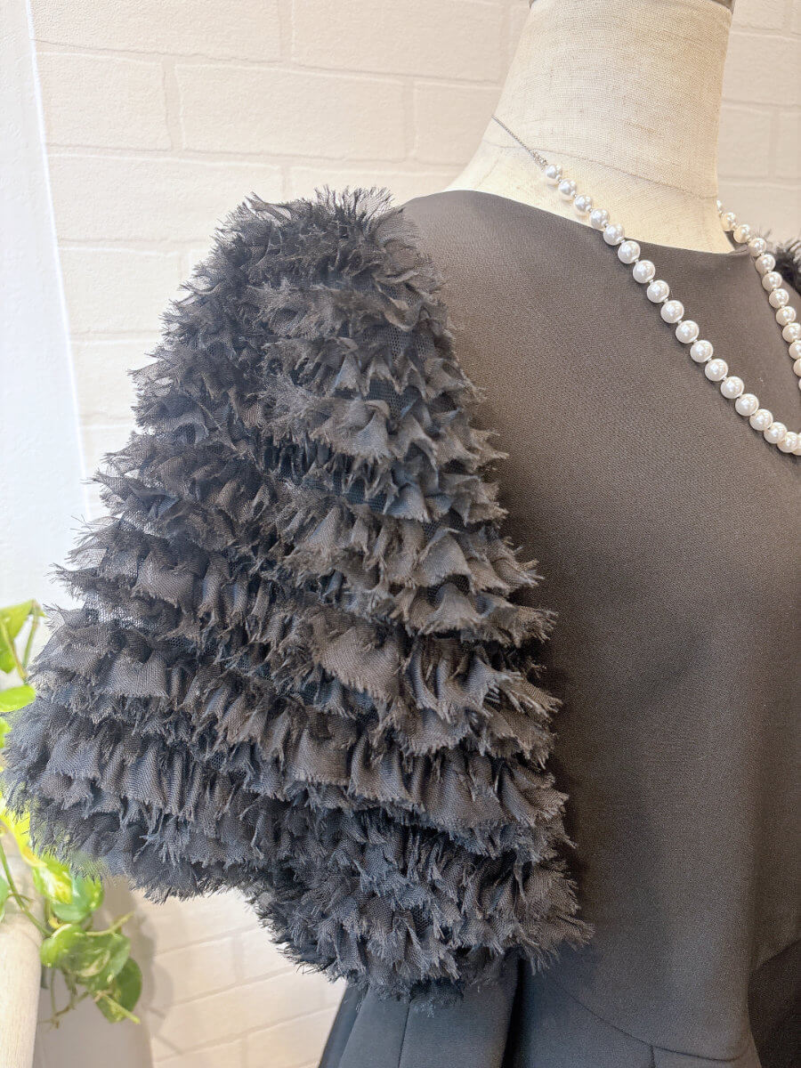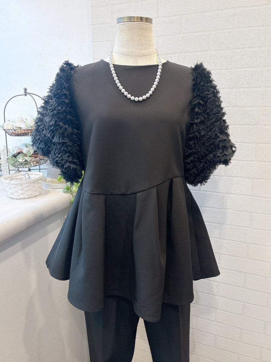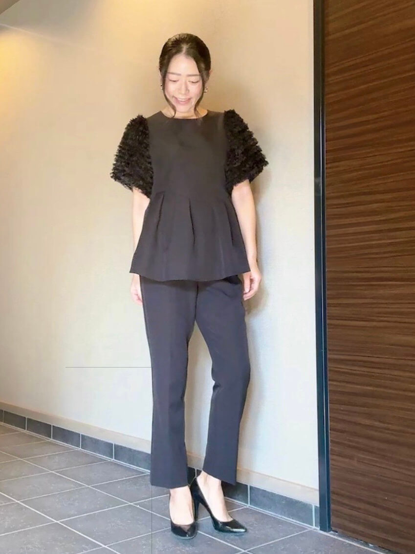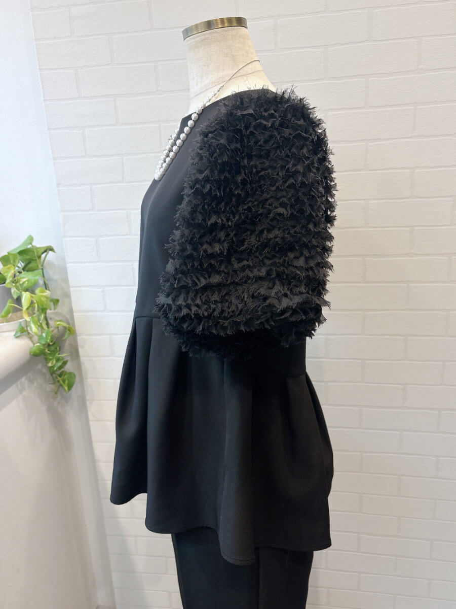 ◇商品について:ブラックのセットアップパンツドレスです。チュールのボリューム袖とアシンメトリ―なペプラムのトップスがシンプルなパンツを上品に華やかに。パンツはスッキリしたシルエットでトップスとのメリハリがあります。結婚式だけでなくパーティやお食事会、会社のセレモニーなど幅広くご利用頂けます。
