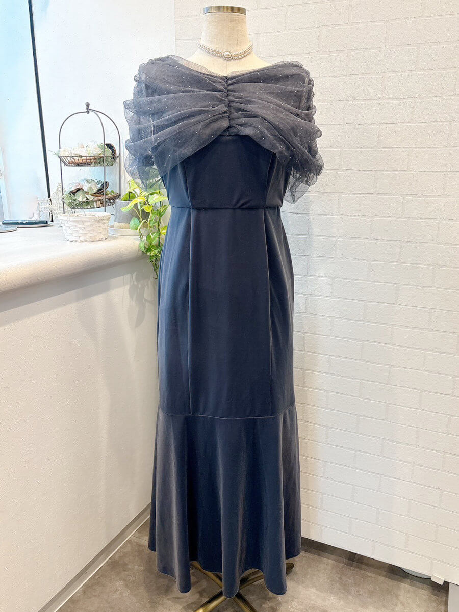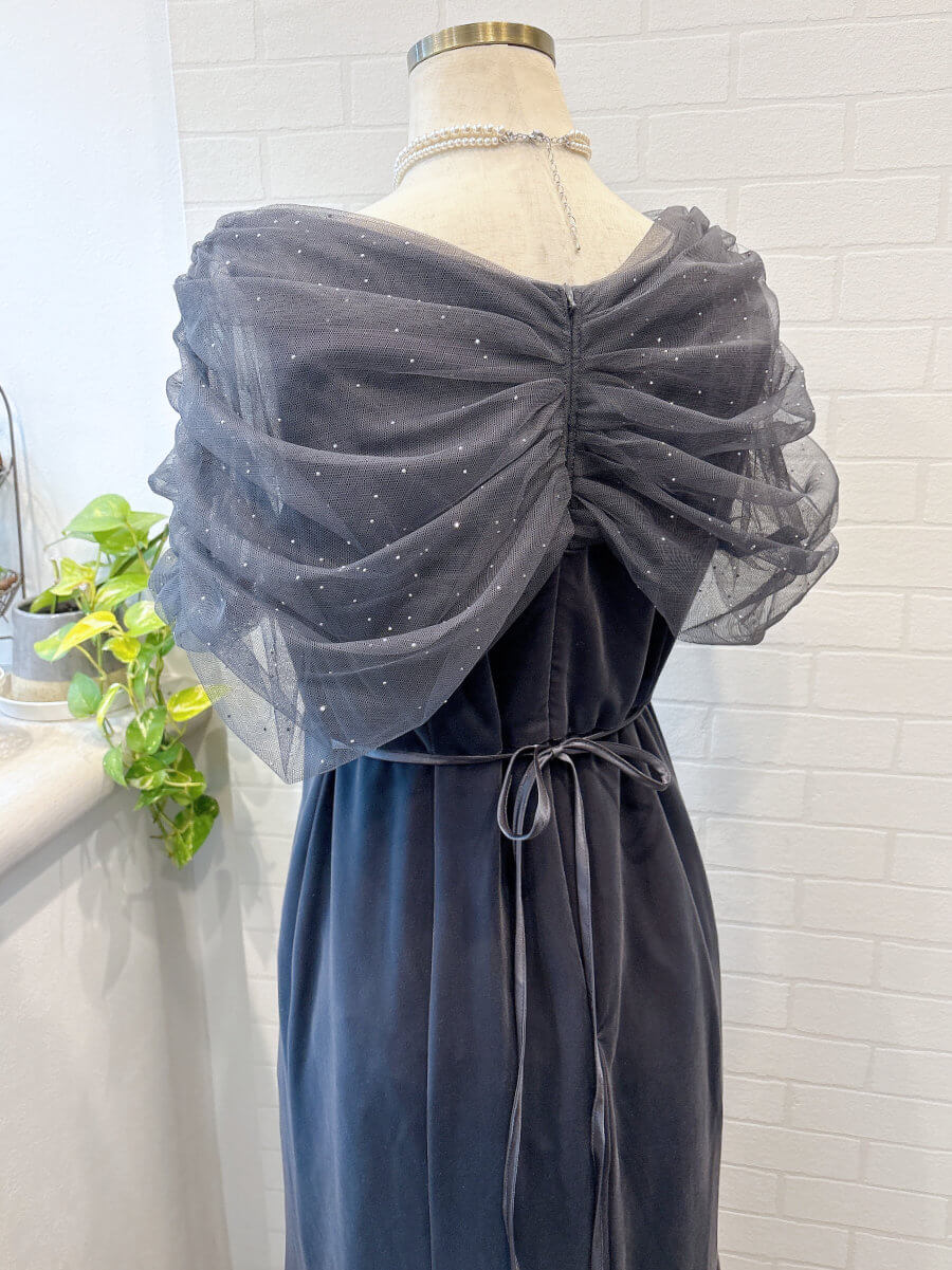 ◇商品について:上品な輝きのあるドットのチュールと柔らかなベロアの組み合わせが華やかなドレスです。