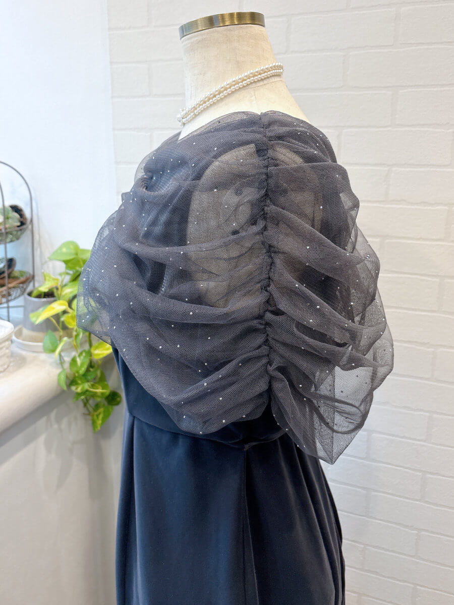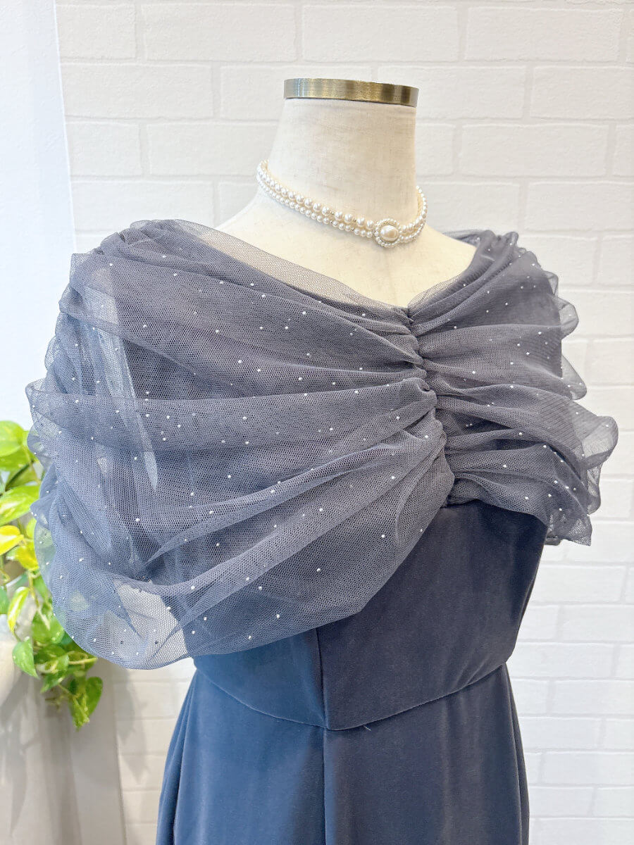 繊細なふんわりチュールが肩周りを包み込みケープを羽織っているようなシルエットに。
