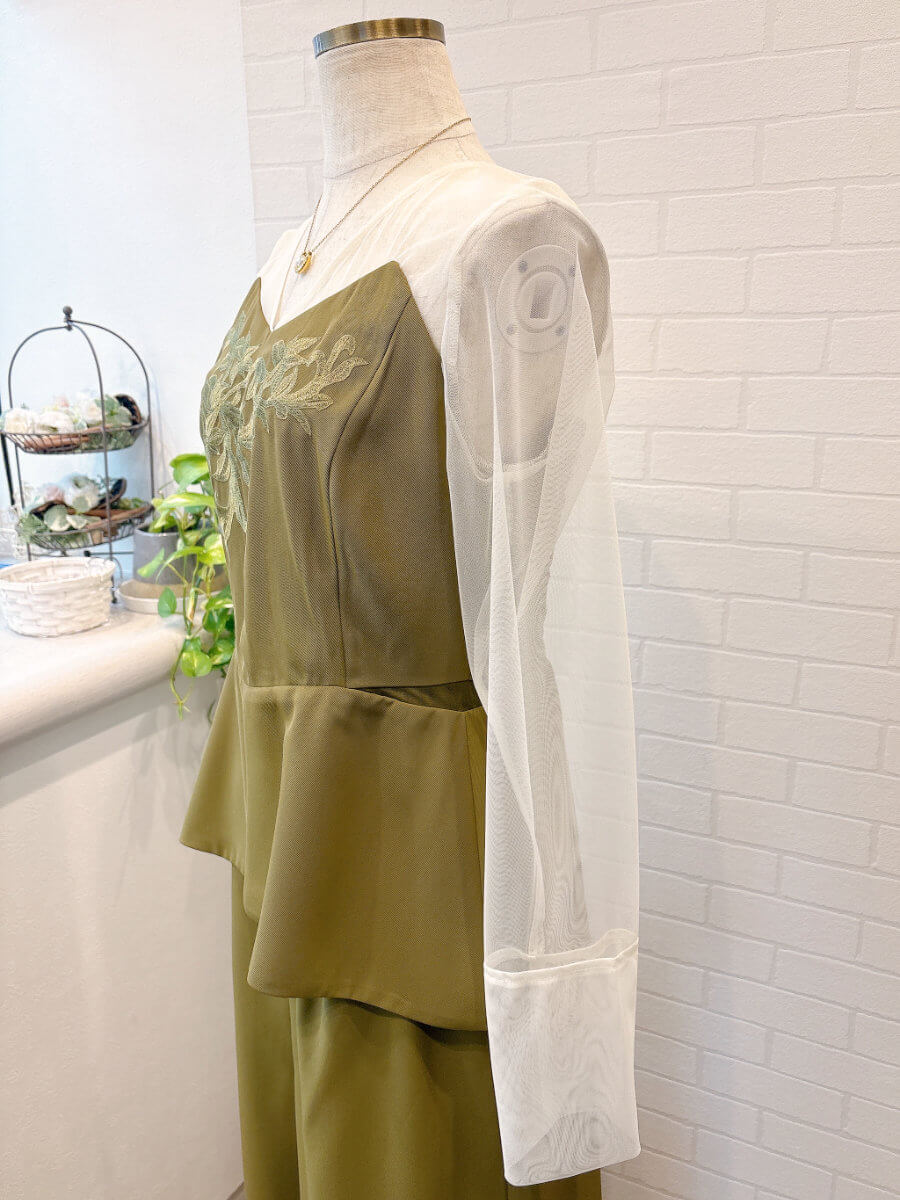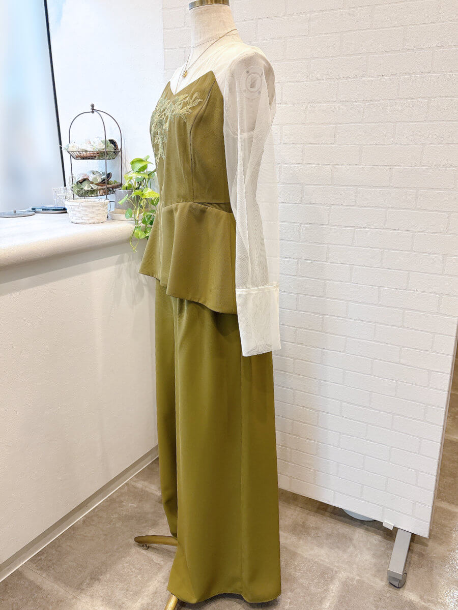 ◇商品について:シアーのインナーがドッキングされたセットアップパンツドレスです。ほどよいペプラムですっきりシルエットに。シアーはアイボリーでオリーブとの組み合わせで華やかに。胸元はVネックなのでつまったデザインが主流の昨今には珍しくお探しの方にはうれしい商品です。上品な刺繍は同系色で施されておりウエストサイド部分に実はシアーで抜け感をいれています。気づかれないくらいのさりげなさで透け感がありファッション性のある商品です。パンツはワイドで美しいラインが際立ちます。トップス、パンツ共に背部にゴムが採用されておりサイズ調整が可能です。