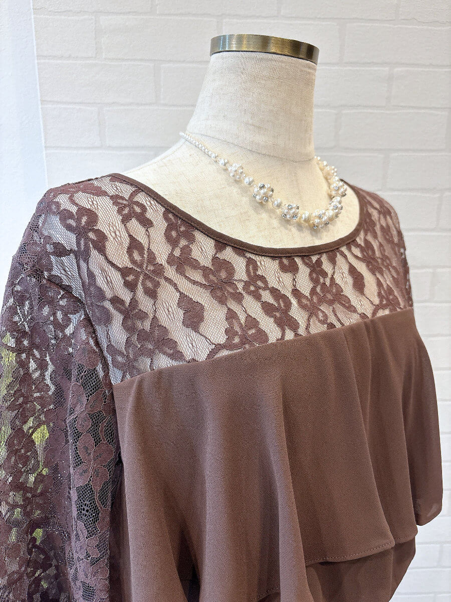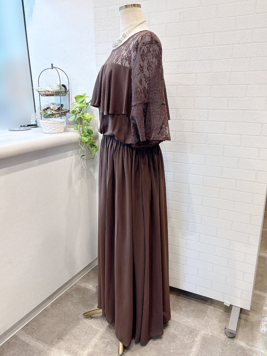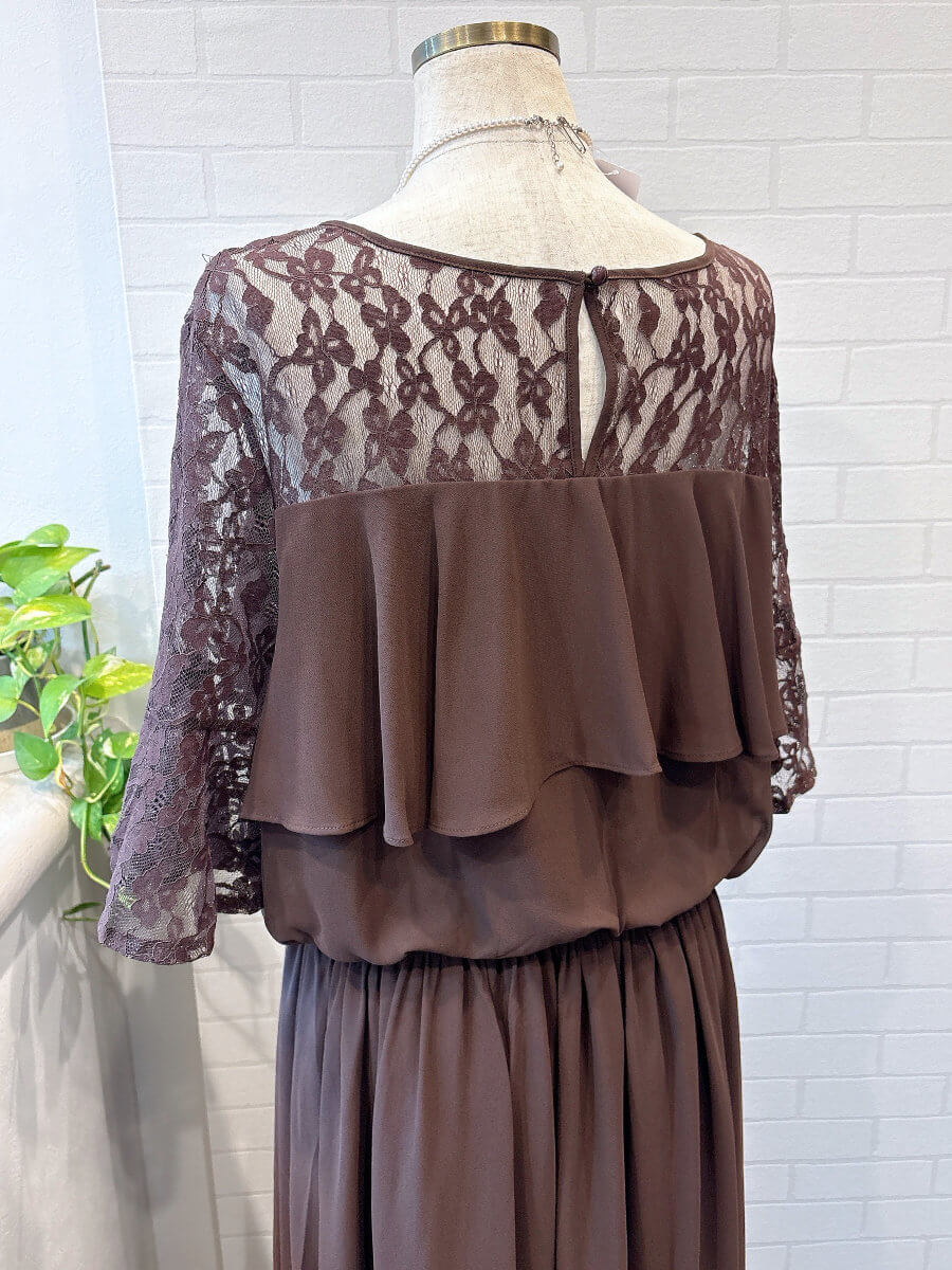 ◇商品について:ウエストがゴムなので伸縮性があります。胸元のフレアと高めの切り返しで足長効果があります。シンプルで上品なシフォンスカートはセミフレアなのでボリュームを抑えてくれます。デコルテのレースで抜け感をプラス。重く見えがちが胸元フリルもすっきり感がでます。ボタンひとつで脱着ができるのでファスナーが苦手な方に嬉しい一着です。