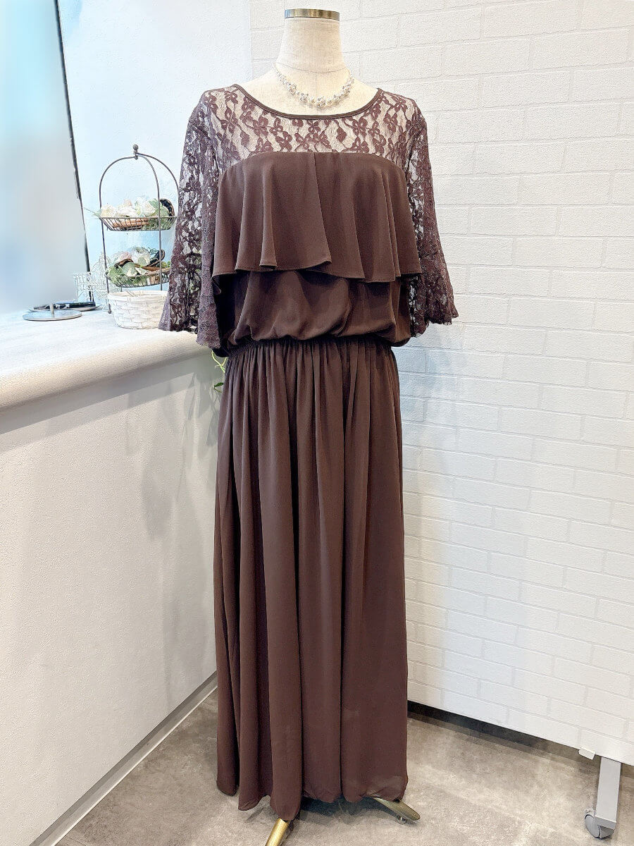 ◇商品について:ウエストがゴムなので伸縮性があります。胸元のフレアと高めの切り返しで足長効果があります。シンプルで上品なシフォンスカートはセミフレアなのでボリュームを抑えてくれます。デコルテのレースで抜け感をプラス。重く見えがちが胸元フリルもすっきり感がでます。ボタンひとつで脱着ができるのでファスナーが苦手な方に嬉しい一着です。