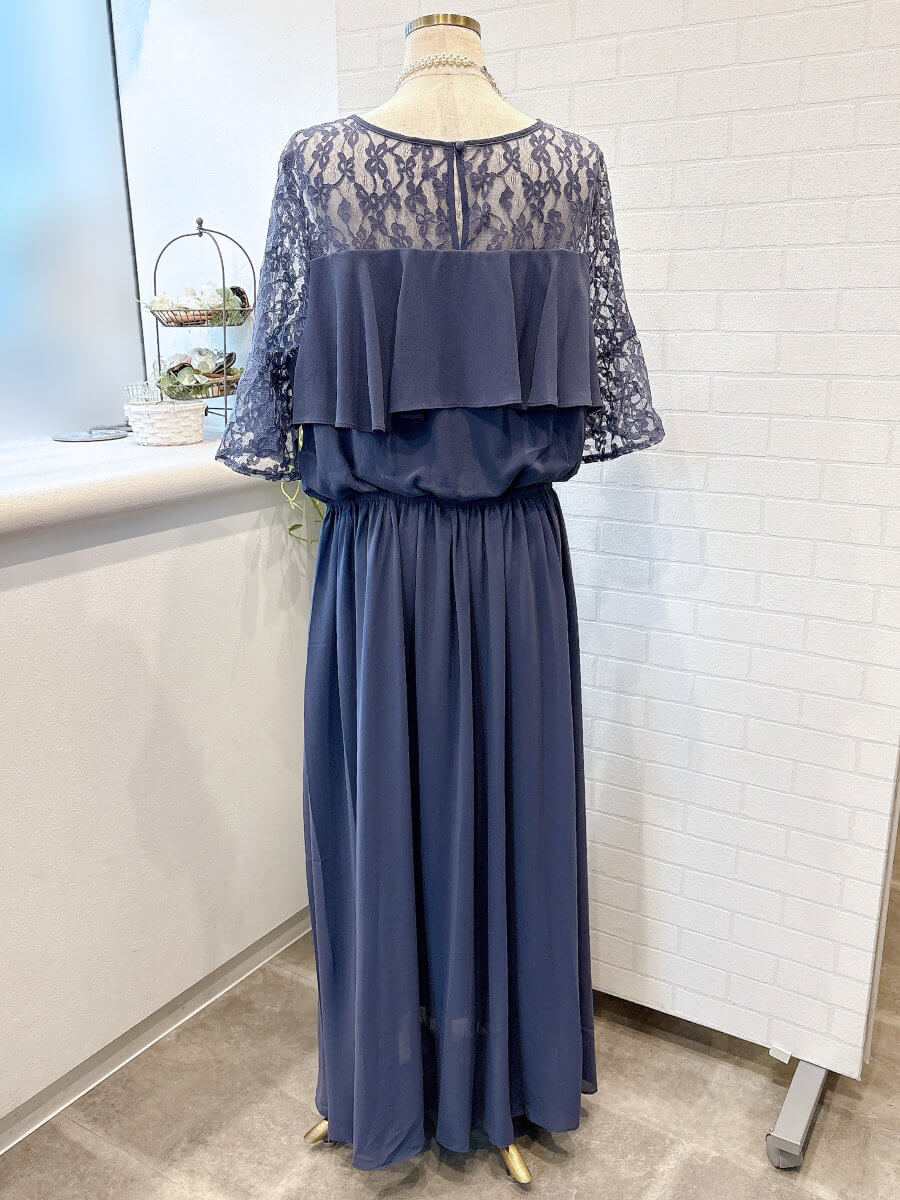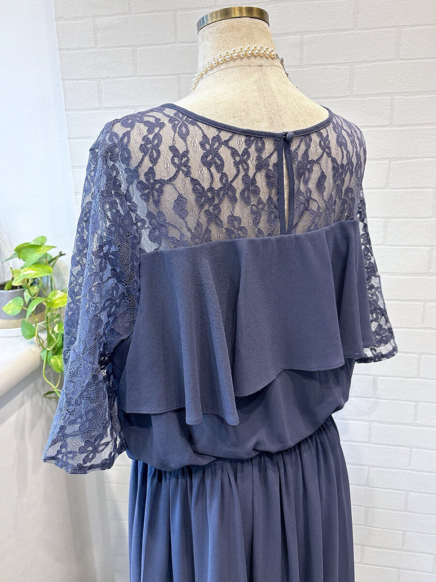 ◇商品について:ウエストがゴムなので伸縮性があります。胸元のフレアと高めの切り返しで足長効果があります。シンプルで上品なシフォンスカートはセミフレアなのでボリュームを抑えてくれます。デコルテのレースで抜け感をプラス。重く見えがちが胸元フリルもすっきり感がでます。ボタンひとつで脱着ができるのでファスナーが苦手な方に嬉しい一着です。
