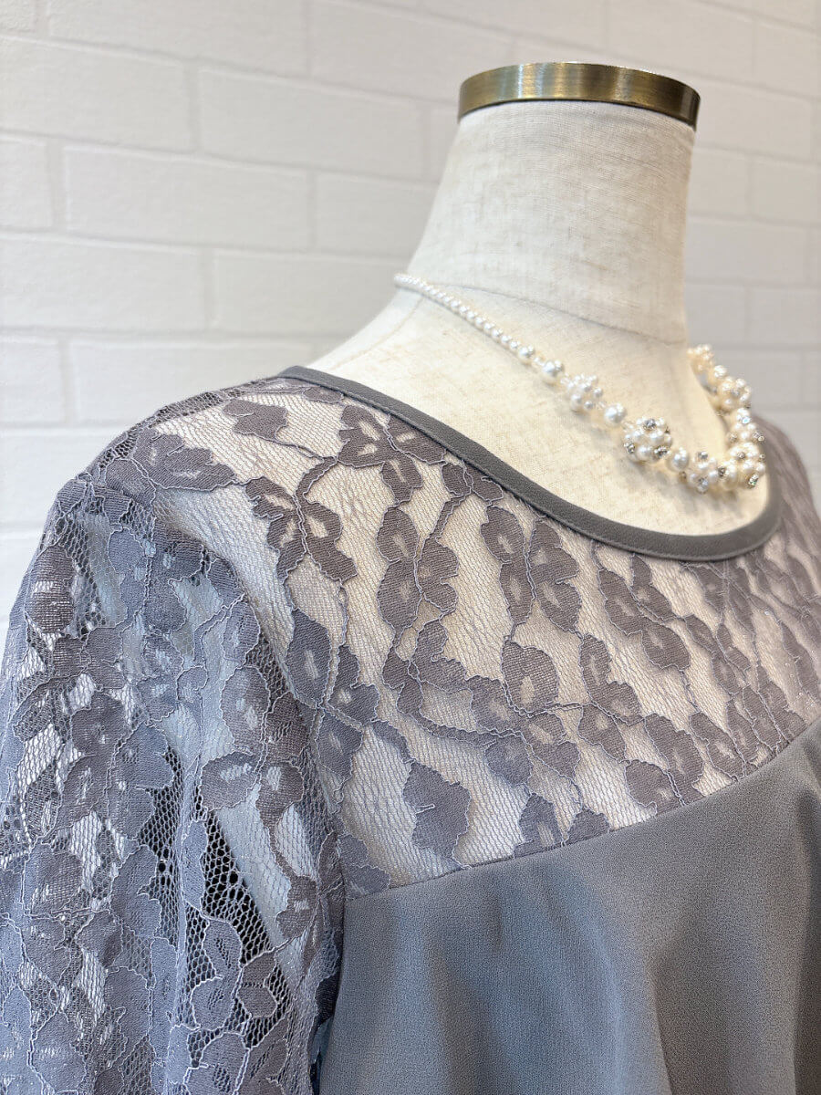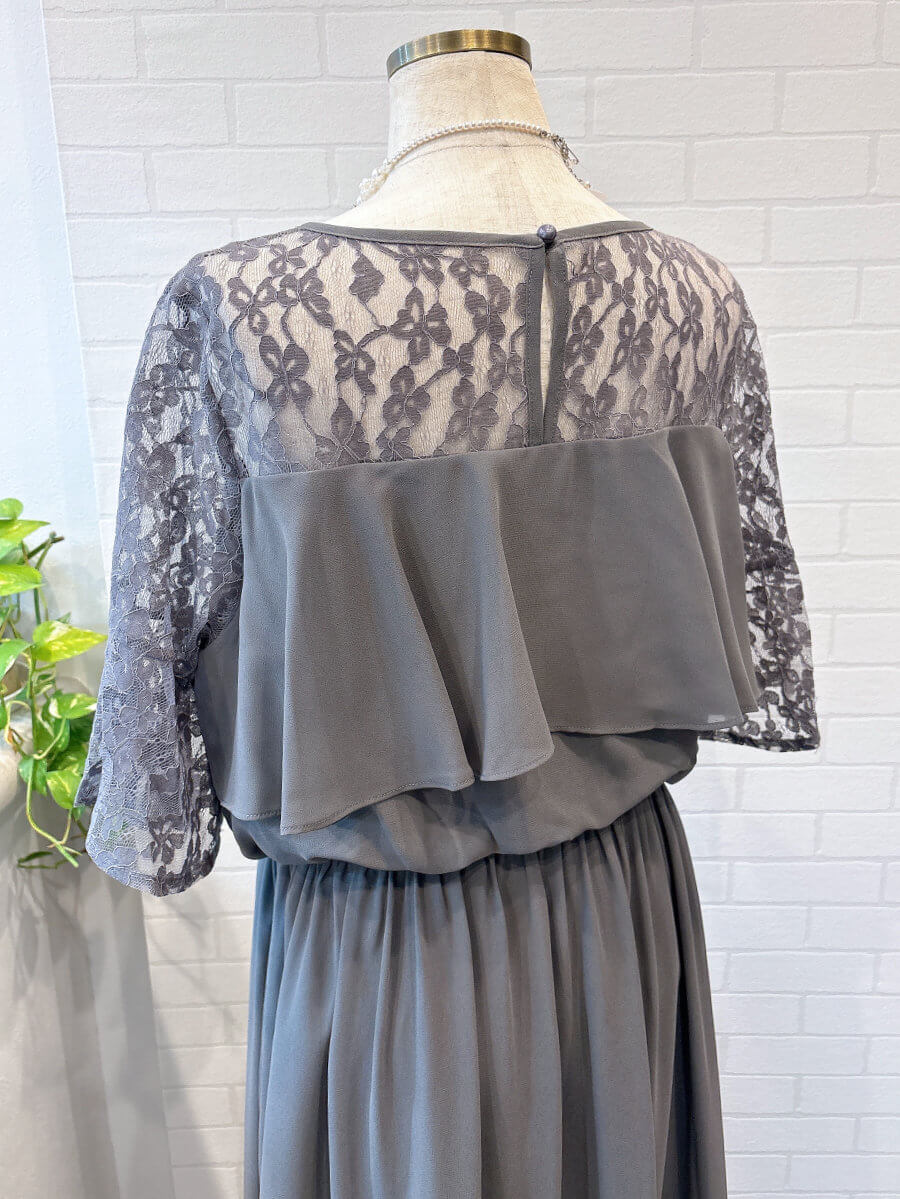 ◇商品について:ウエストがゴムなので伸縮性があります。胸元のフレアと高めの切り返しで足長効果があります。シンプルで上品なシフォンスカートはセミフレアなのでボリュームを抑えてくれます。デコルテのレースで抜け感をプラス。重く見えがちが胸元フリルもすっきり感がでます。ボタンひとつで脱着ができるのでファスナーが苦手な方に嬉しい一着です。
