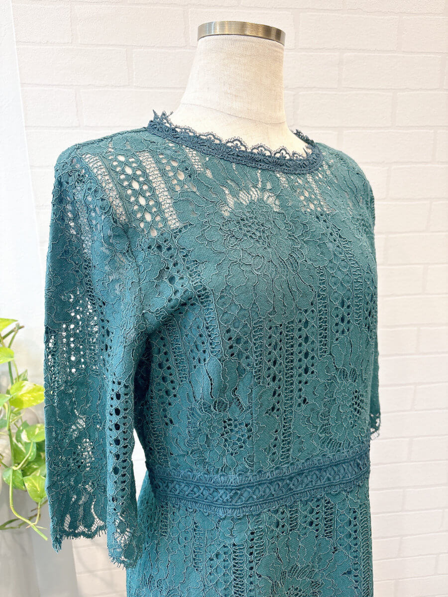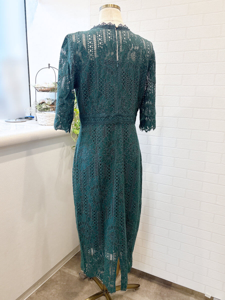 ◇商品について:フラワー柄の総レースがエレガントなタイトシルエットのミモレ丈ワンピースドレス