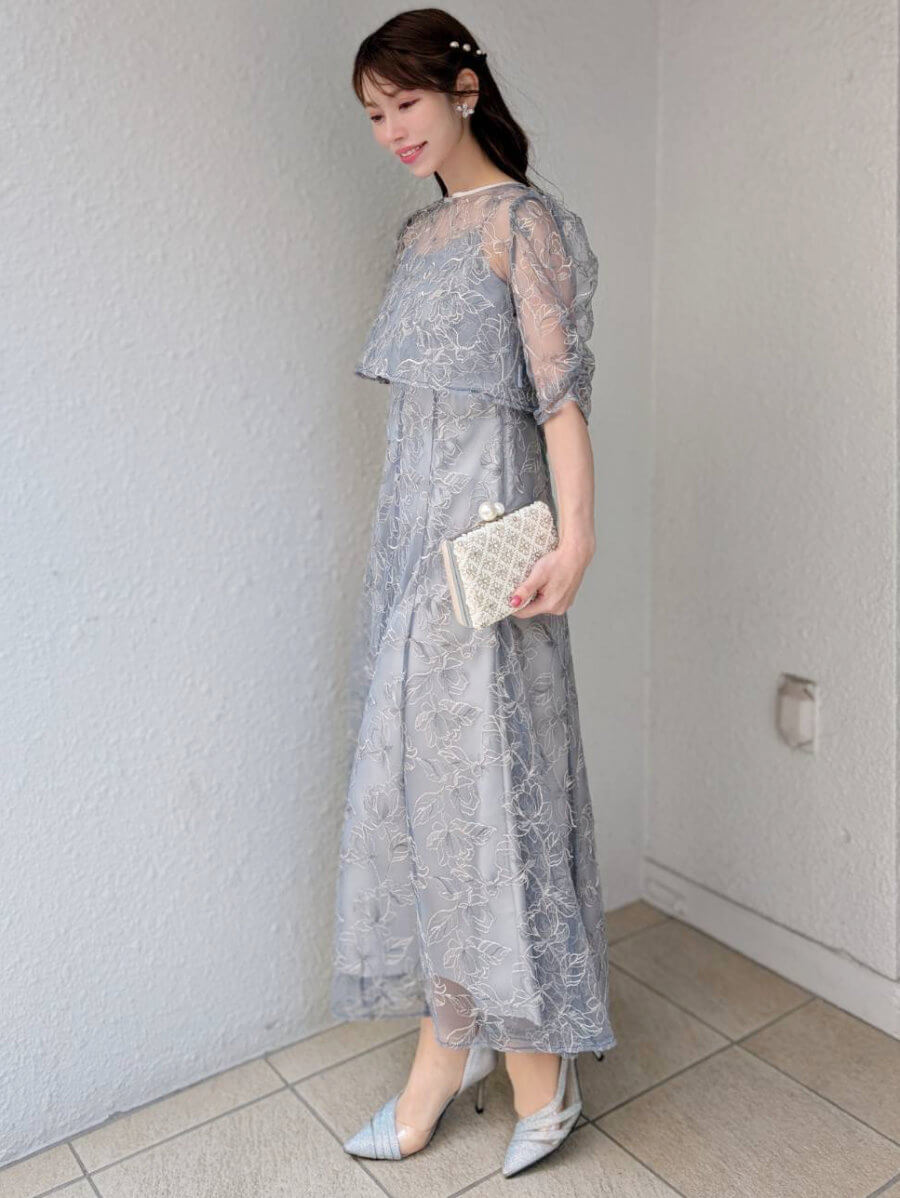 ◇商品について:花柄の刺繍レースを使用した2ピースドレス。ウエストとバスト部分は背部がゴムになっておりサイズ調整が可能。キャミソールワンピースなので肩紐で丈感の調整もできます。くすみ系のお色味で優しい雰囲気に。カシュクール袖で気になる二の腕もうまくカバーしてくれます。ハイウエストなので足長効果とお腹周りカバーもされます。可憐で上品なドレスです。
