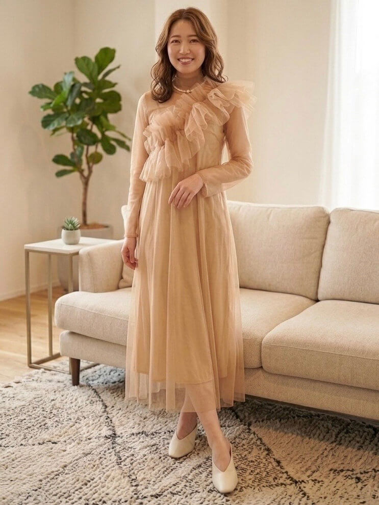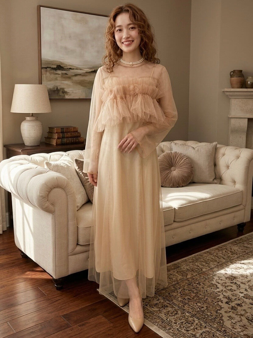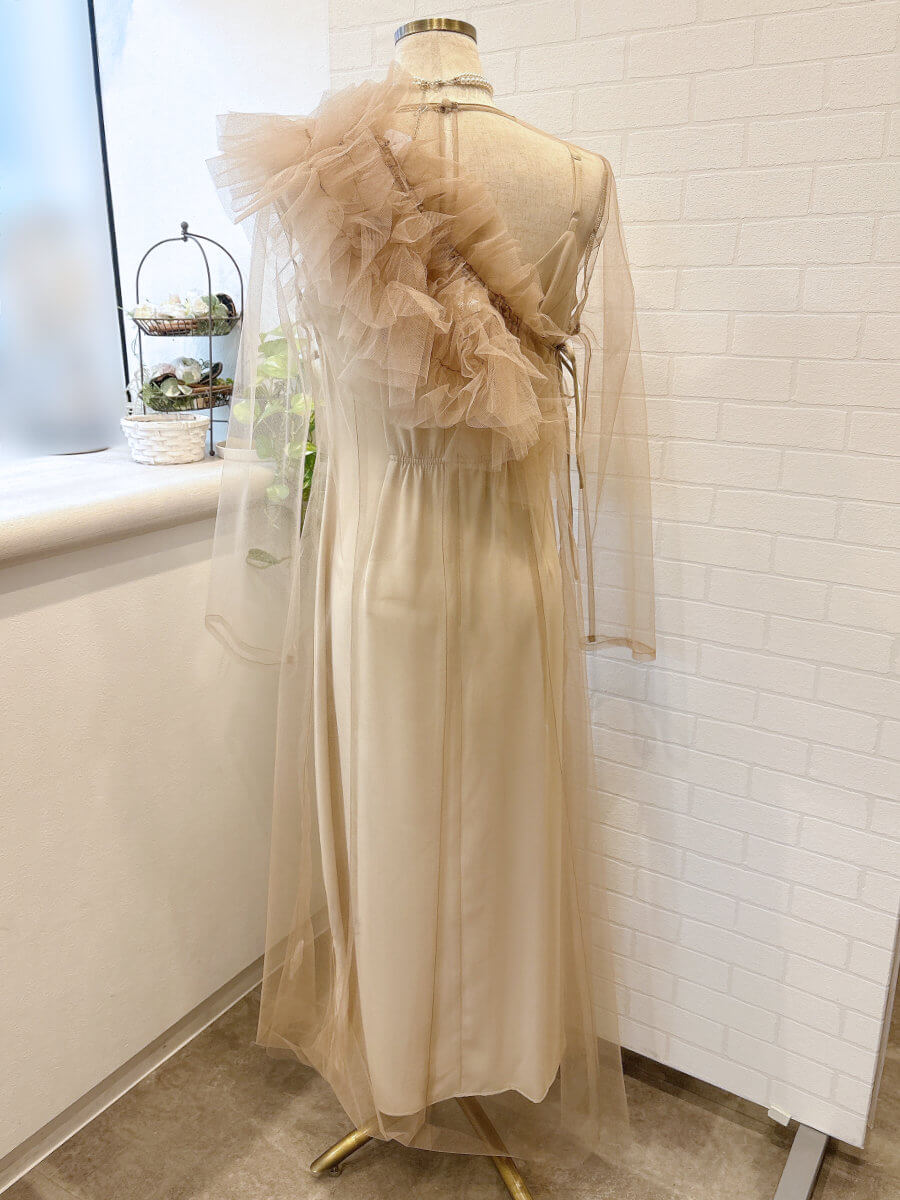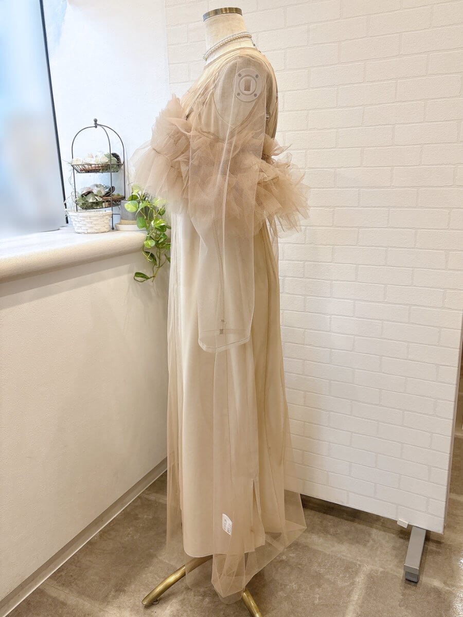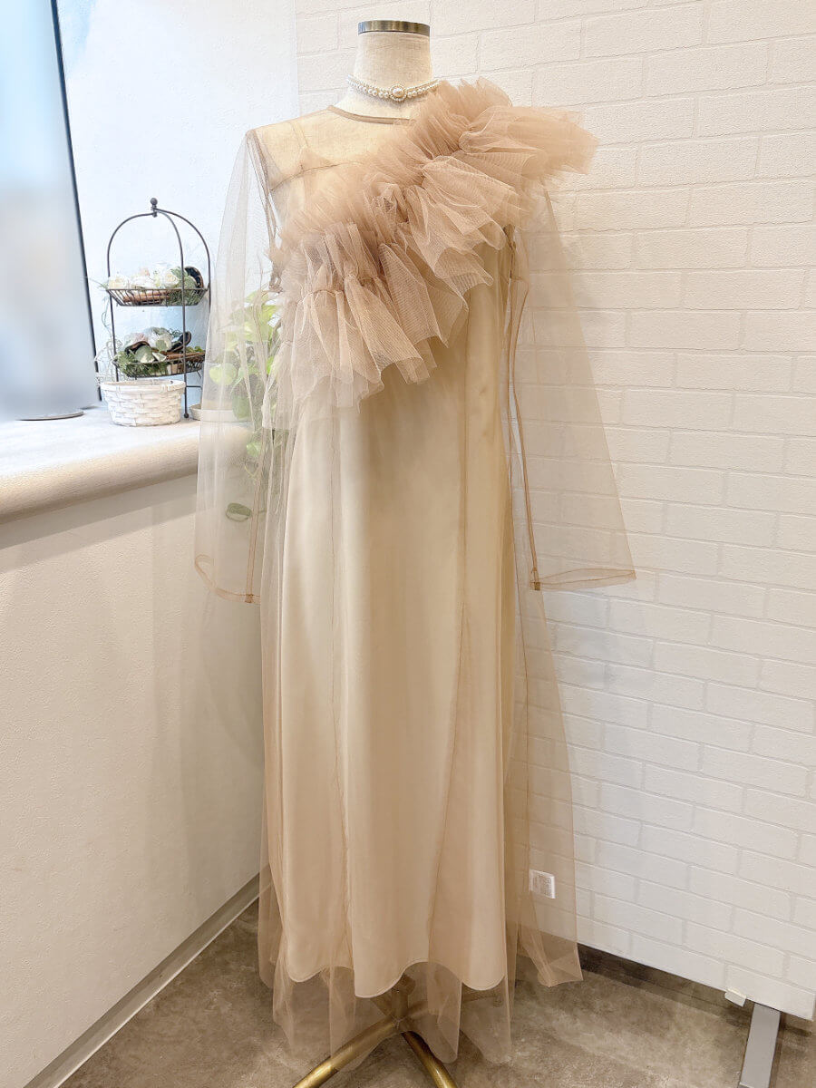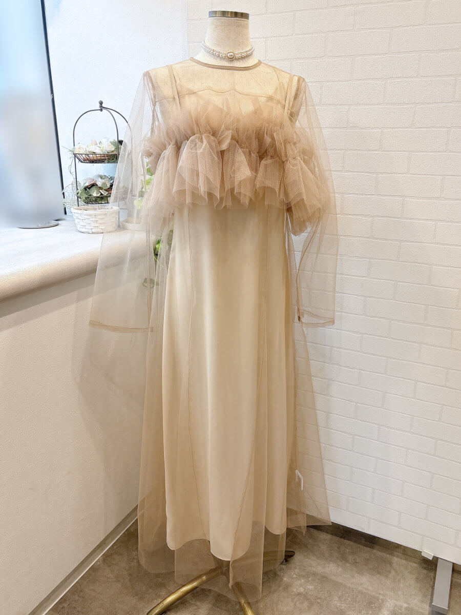 たっぷりのチュールを贅沢に使ったギャザービスチェ、シアードレス、シンプルなインナーワンピースを重ねたレイヤードドレス。