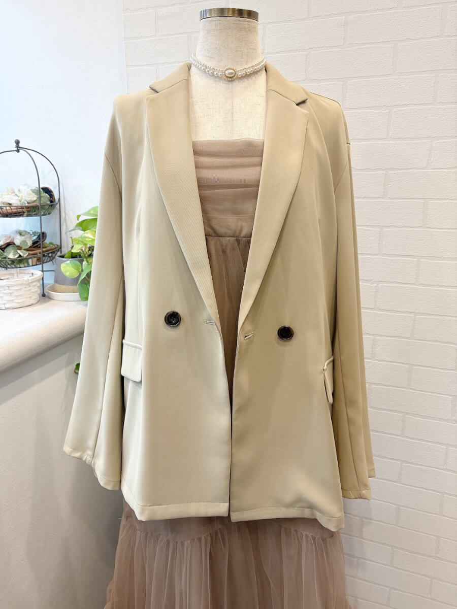 ジャケットは軽めのお素材でオーバーサイズ。ゆるっと今っぽく着こなせます。裏地はなくさらっと着れるので真夏以外は着用できます。ジャケットのポケットはフェイクです。