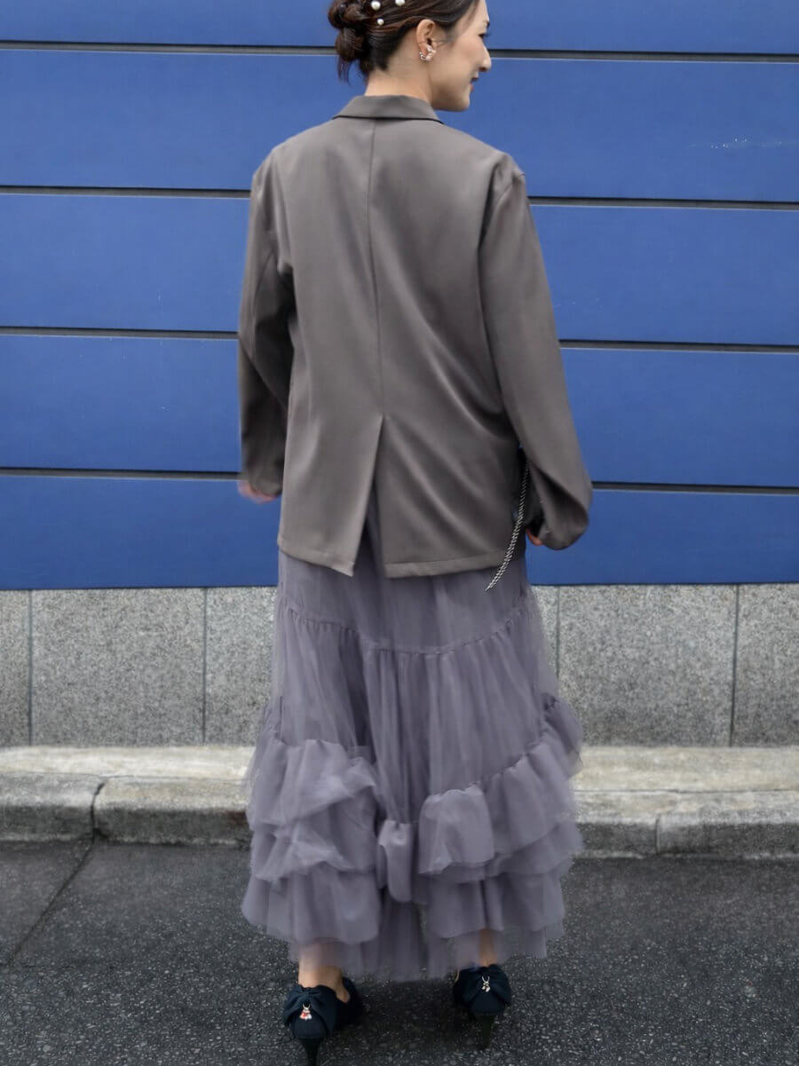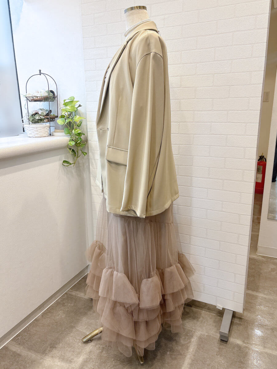 ◇商品について:裾にたっぷりフリルをあしらったチュール素材のキャミワンピースと、ジャケットを組み合わせたセットアイテム。チュールワンピースはハイウエストデザインでゆったりシルエット。マタニティ初期の方も着用できます。程よく張り感のあるチュールワンピースはトップスを変えて華やかに着こなすこともできます。