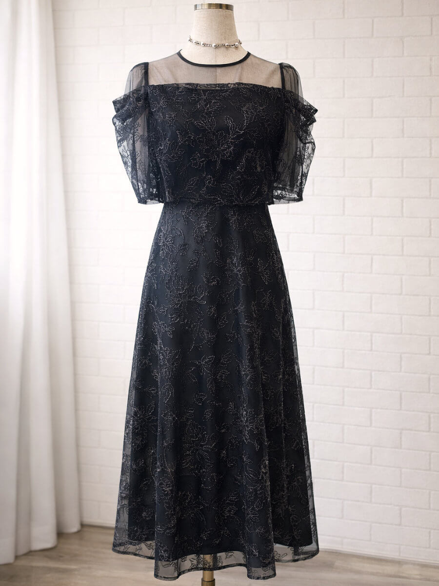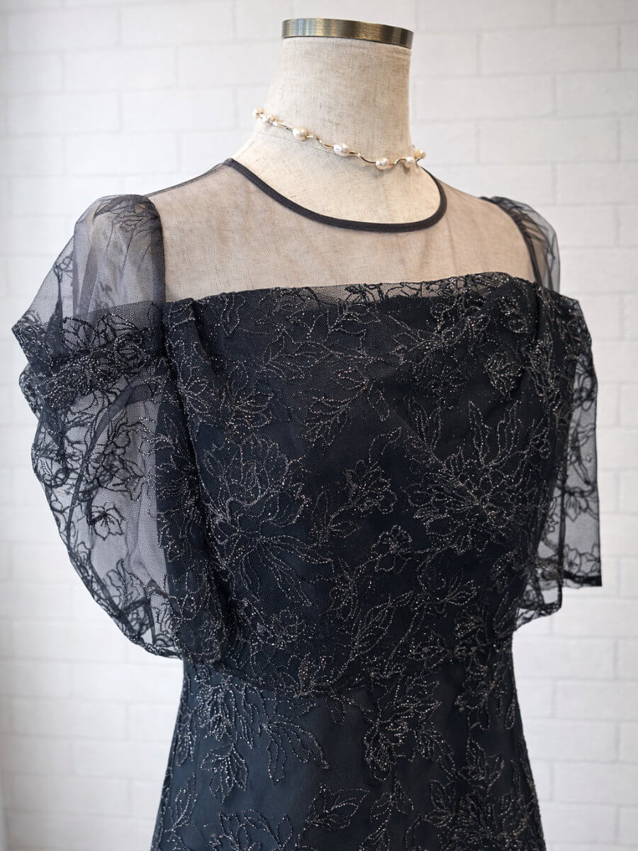 ◇商品について:ラメ糸を織り込んだ華やかな刺繍レースが輝きのあるドレスです。程よい透け感のシアーでデコルテをデザイン。オフショル風のタック入りスリーブで女性らしいドレスです。