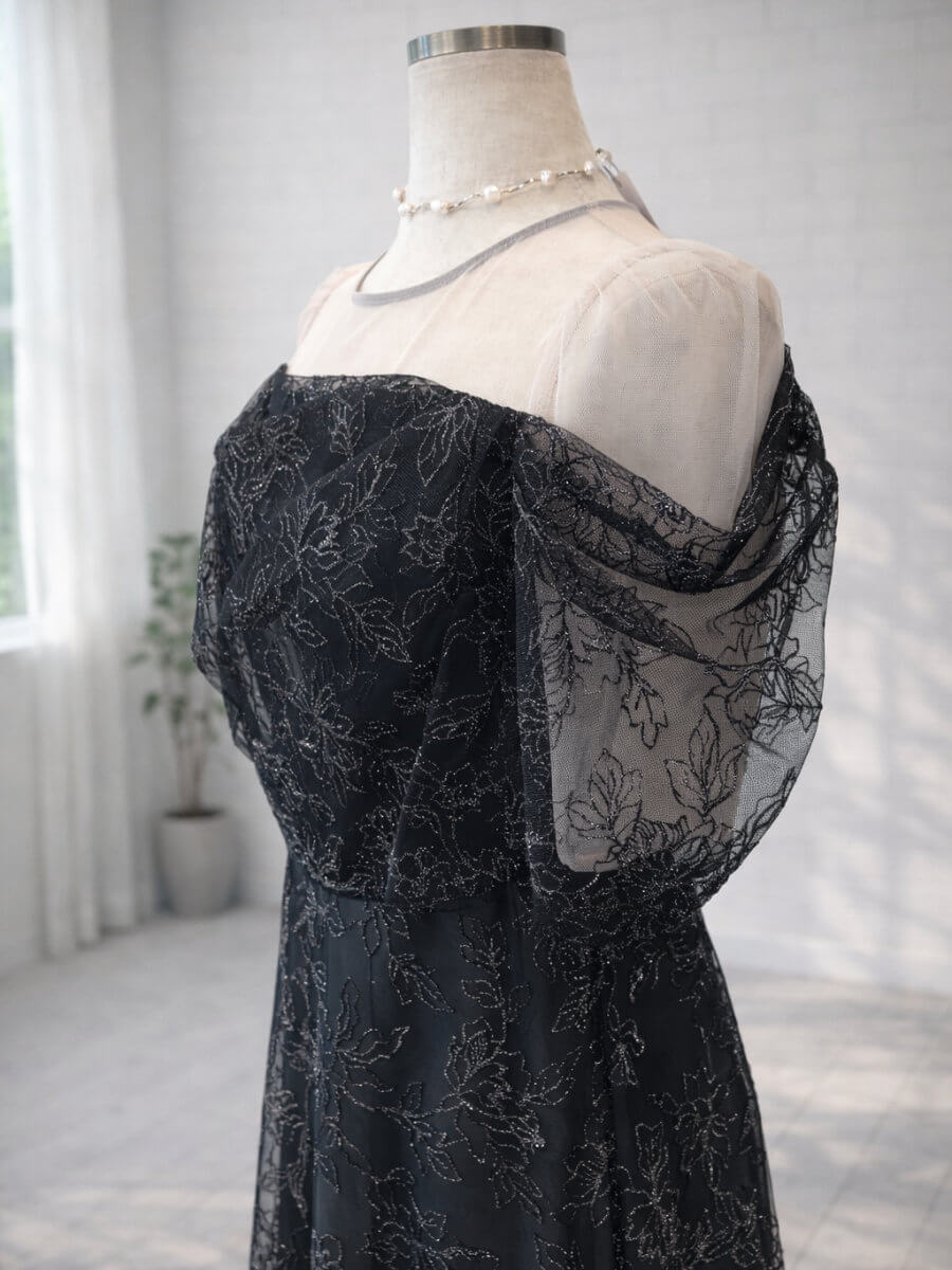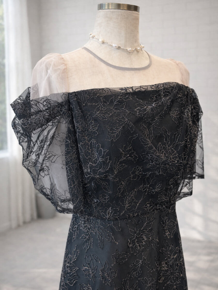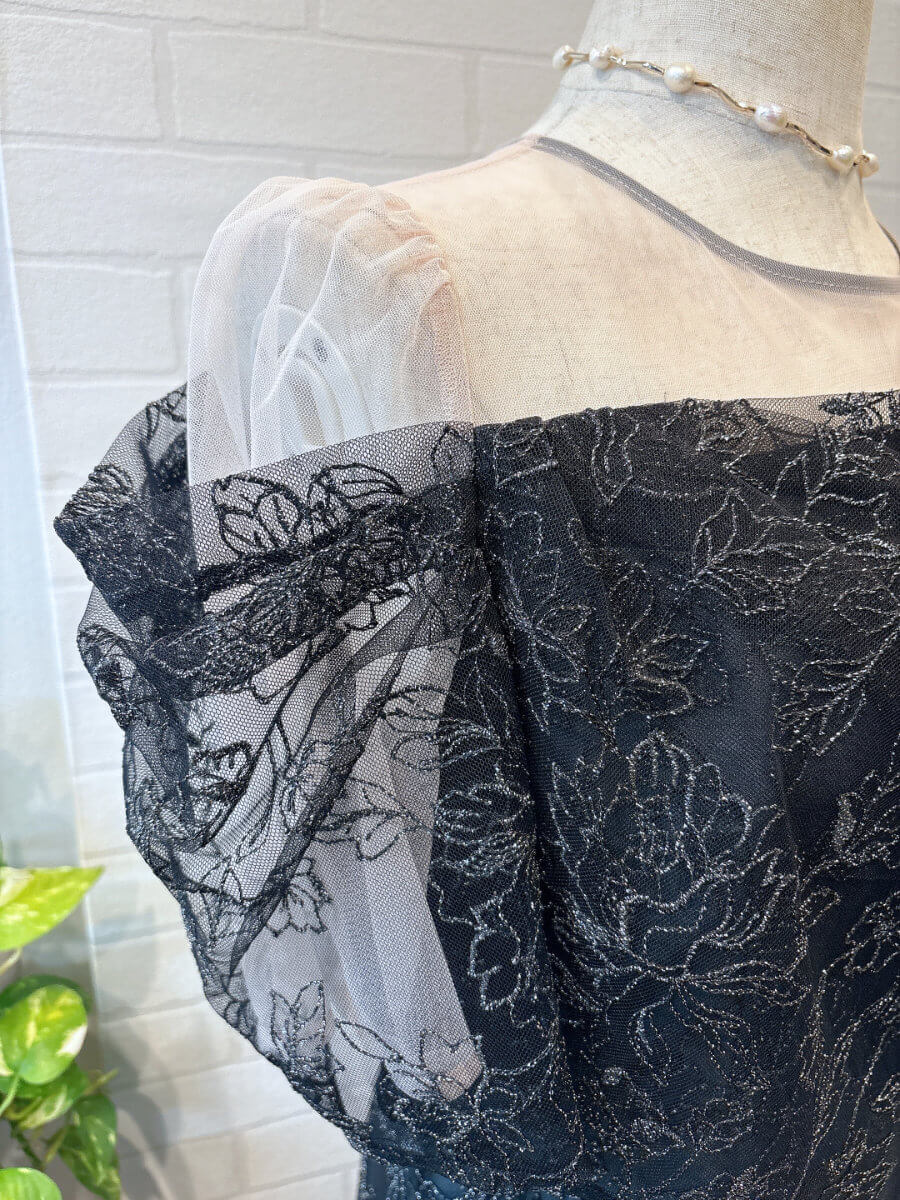 ◇商品について:ラメ糸を織り込んだ華やかな刺繍レースが輝きのあるドレスです。程よい透け感のシアーでデコルテをデザイン。オフショル風のタック入りスリーブで女性らしいドレスです。デコルテのシアー部分はベージュ系のお色味で首回りはグレーの縁取りが裏側に縫い付けされています。刺繍はラメ糸で華やかさがプラスされています。上品な華やかさがあるので結婚式だけでなくパーティや謝恩会にもおすすめです。