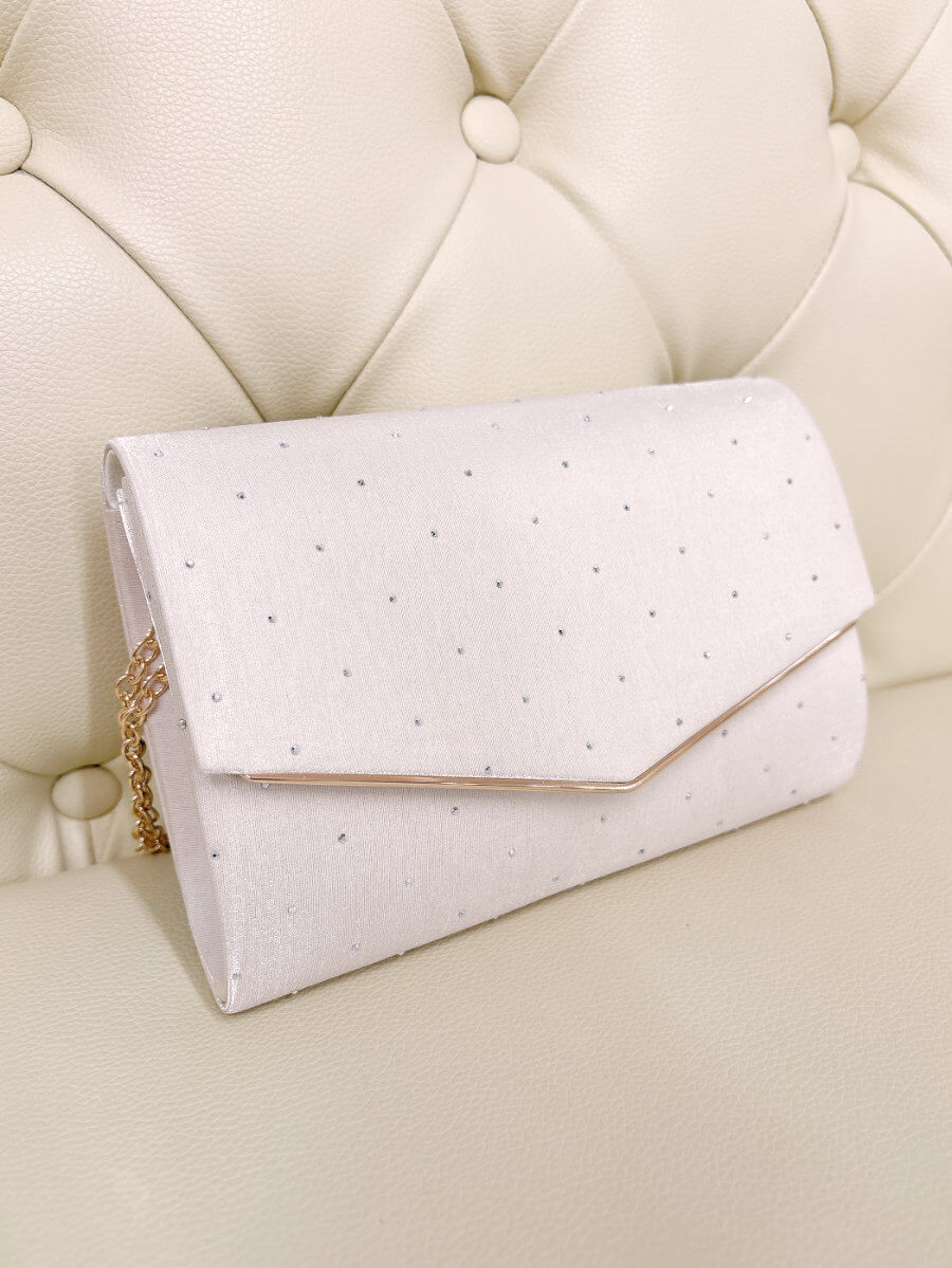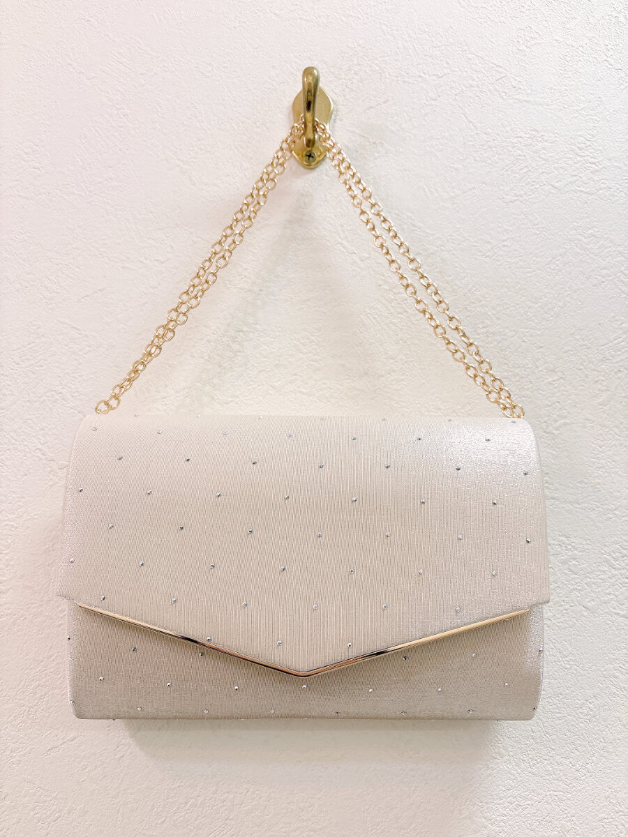 ◇商品について:光沢のあるシャンパンベージュにシルバーのラインストーンが散りばめられたコロンとした可愛らしいバッグです。金具部分はゴールドでゴールドのチェーンが付属します。ご祝儀袋単体での収納は可能ですが袱紗は入りずらい大きさです。内側ポケットにはリップが収納できるポケットが内蔵。バッグの中で転がらずさっと使用できます。