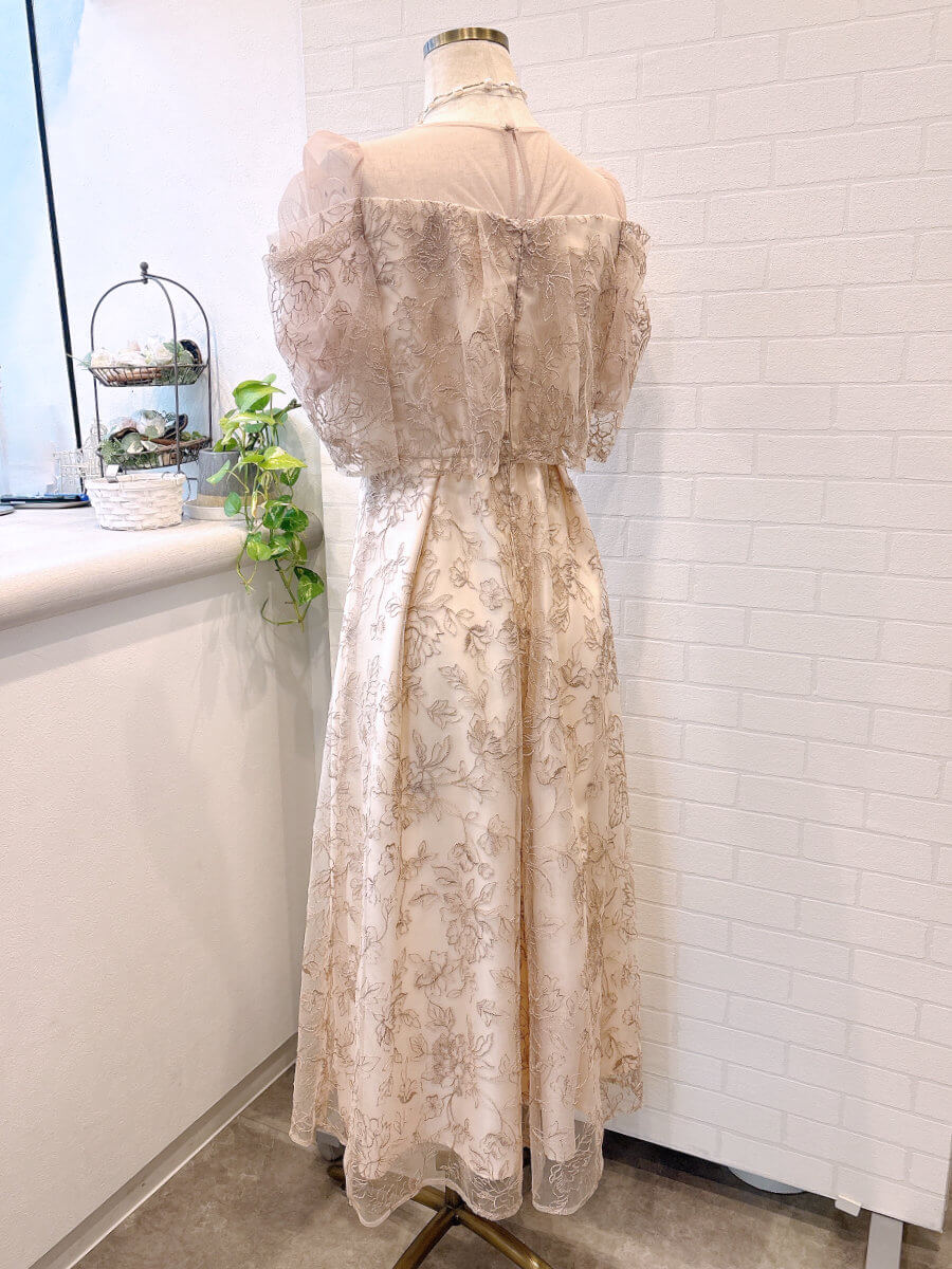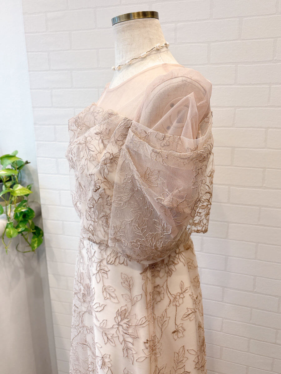 ◇商品について:ラメ糸を織り込んだ華やかな刺繍レースが輝きのあるドレスです。程よい透け感のシアーでデコルテをデザイン。オフショル風のタック入りスリーブで女性らしいドレスです。