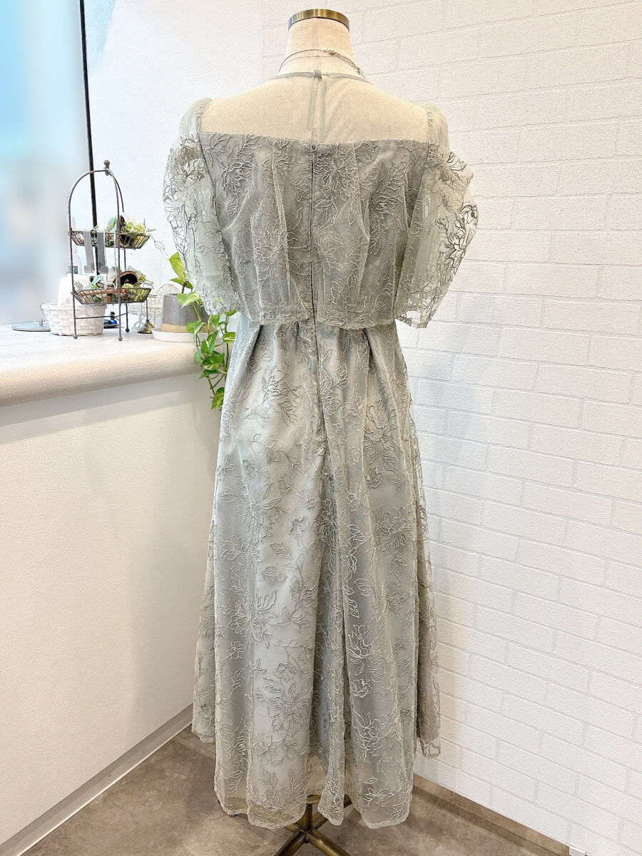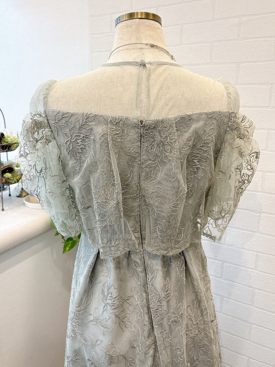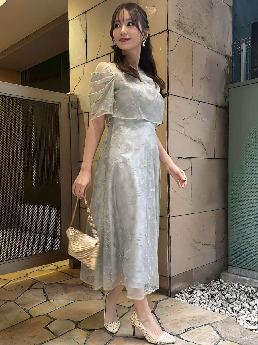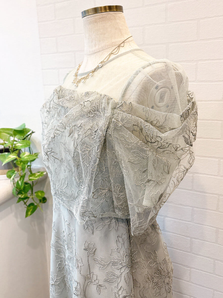 ◇商品について:ラメ糸を織り込んだ華やかな刺繍レースが輝きのあるドレスです。程よい透け感のシアーでデコルテをデザイン。オフショル風のタック入りスリーブで女性らしいドレスです。