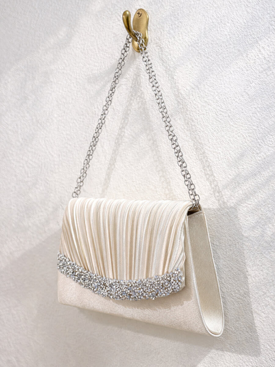 ◇カラー:ベージュ ◇大きさ:底辺21cm 高さ14cm ◇商品について:ベージュにシルバーのビジューが華やかなデザインです。小ぶりでかわいらしく上品な印象に。