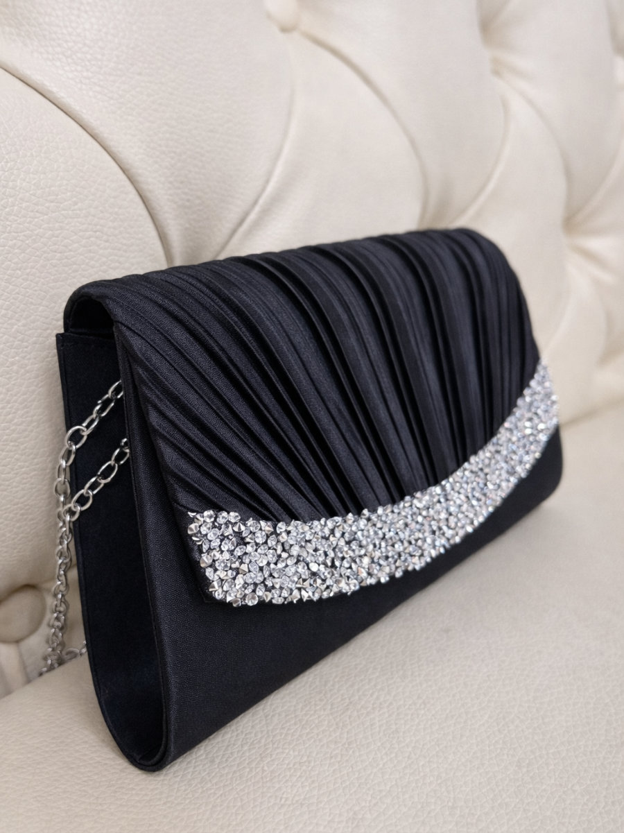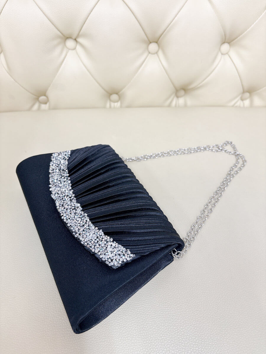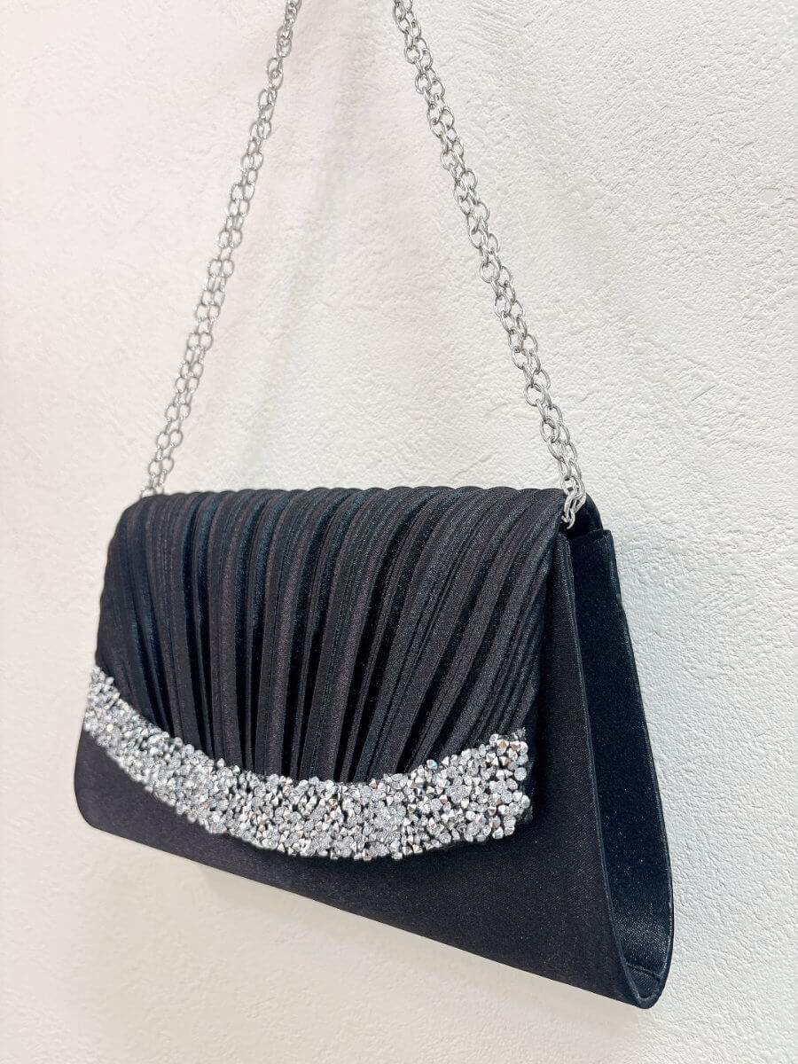◇カラー:ブラック ◇大きさ:底辺21cm 高さ14cm ◇商品について:ブラックにシルバーのビジューが華やかなデザインです。小ぶりでかわいらしく上品な印象に。