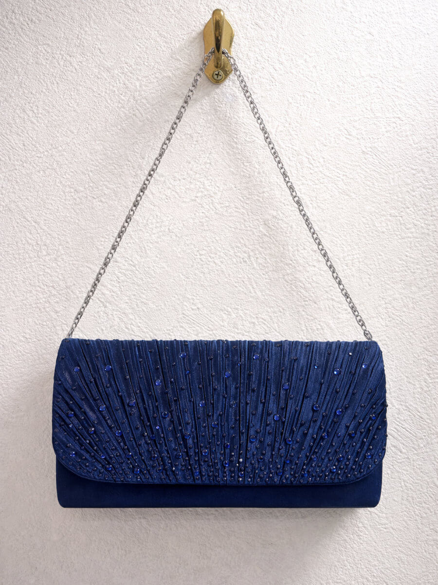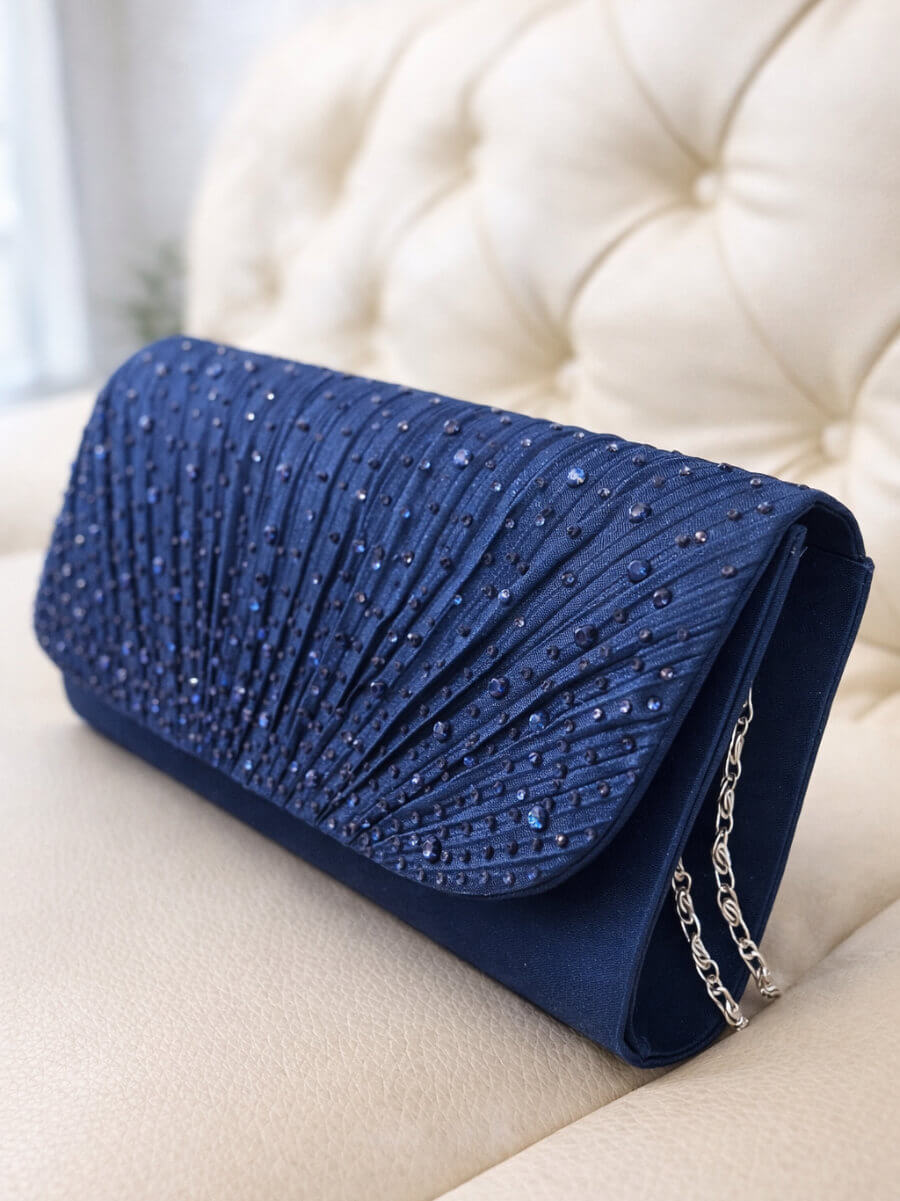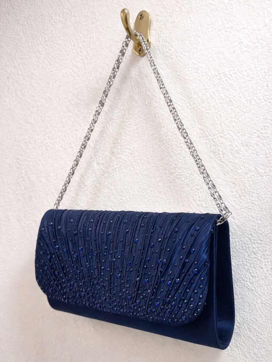 ◇カラー:ネイビー ◇大きさ:横20cm/縦12cm ◇商品について:ネイビーにネイビーのビジューがデザインされた。小ぶりで上品なバッグです。