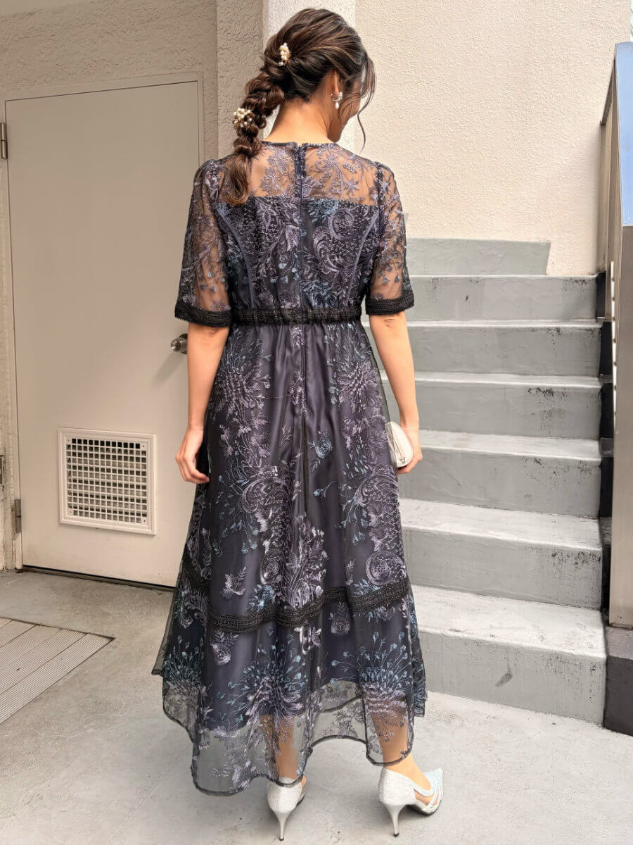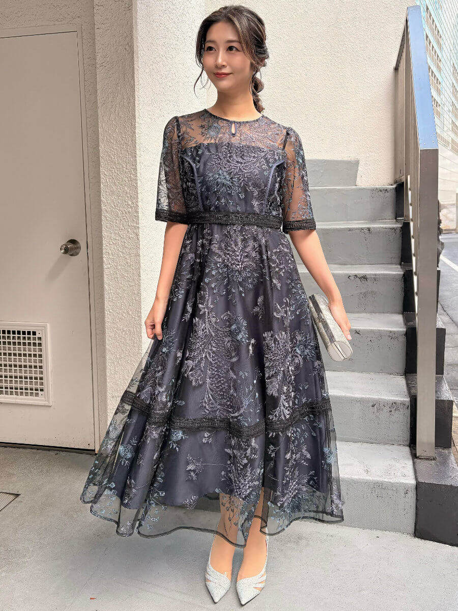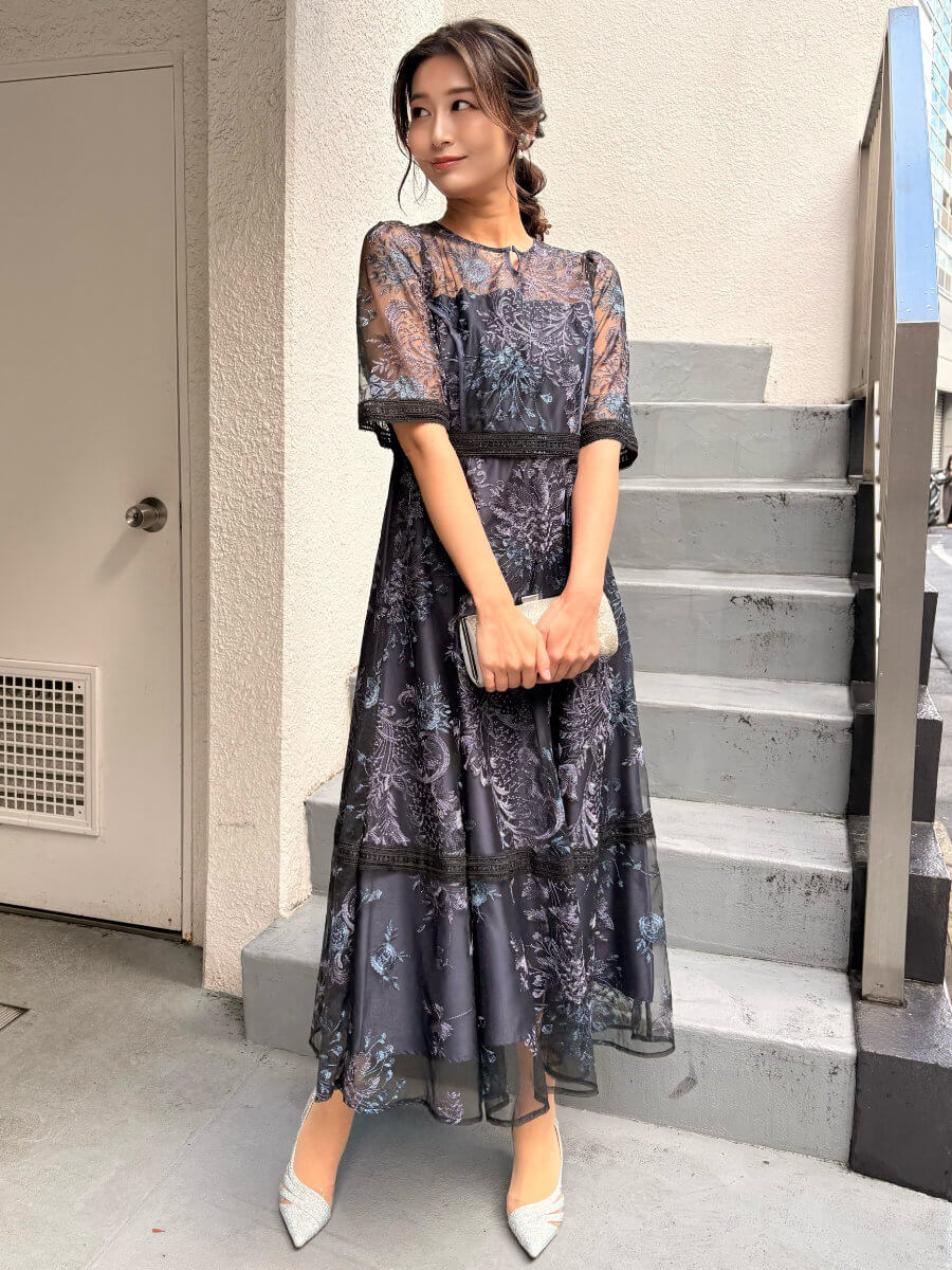 デコルテ、スカート裾部分はさりげなく透けるので程よい抜け感のあるスタイルに。