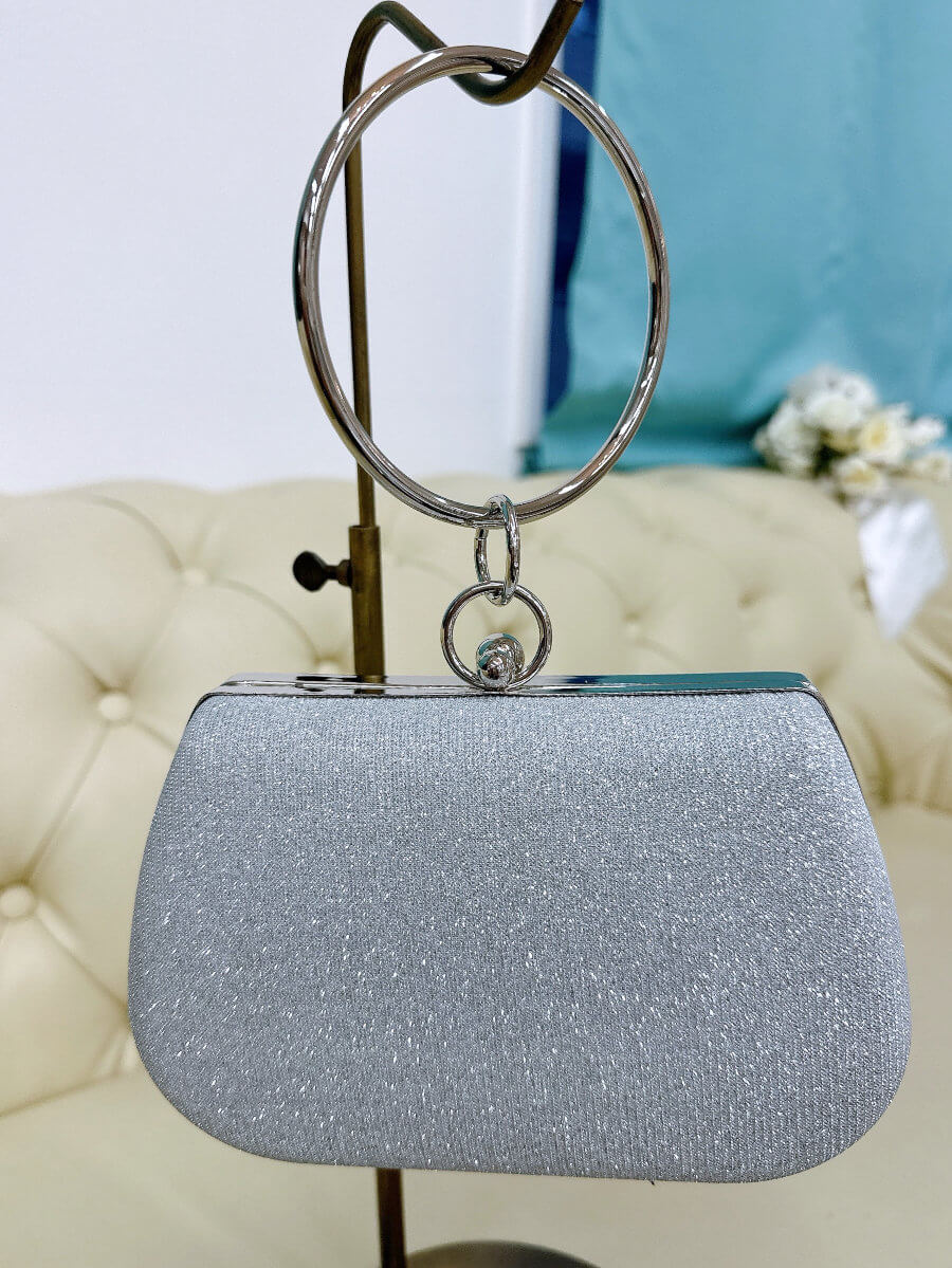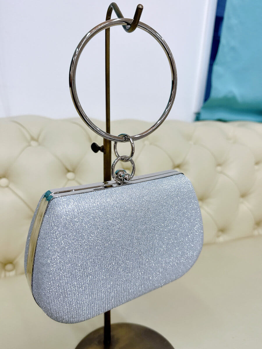 ◇商品について:シルバーの細かいラメでバッグがほどよく輝きます。リングタイプの持ち手がおしゃれでファッションのポイントになります。ハードタイプのバッグなので形崩れせずご利用頂けます。留め具部分は大小のシルバーボールになっていて開ける際は小さい方を大きい方に向けて推して開けてください。