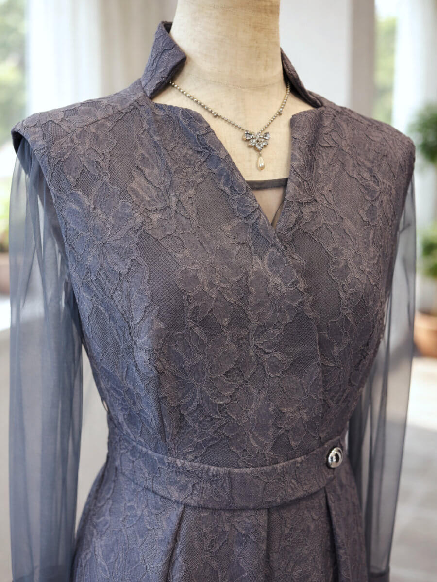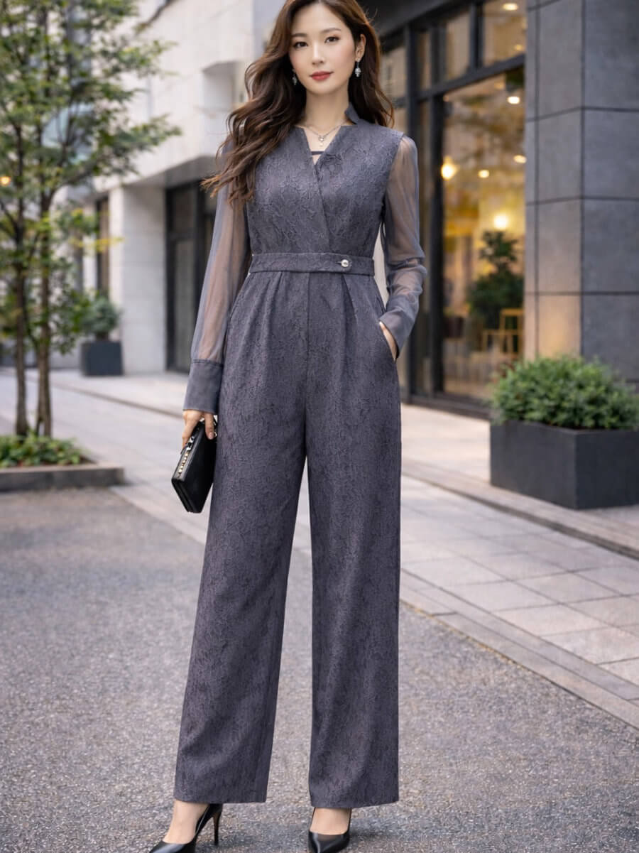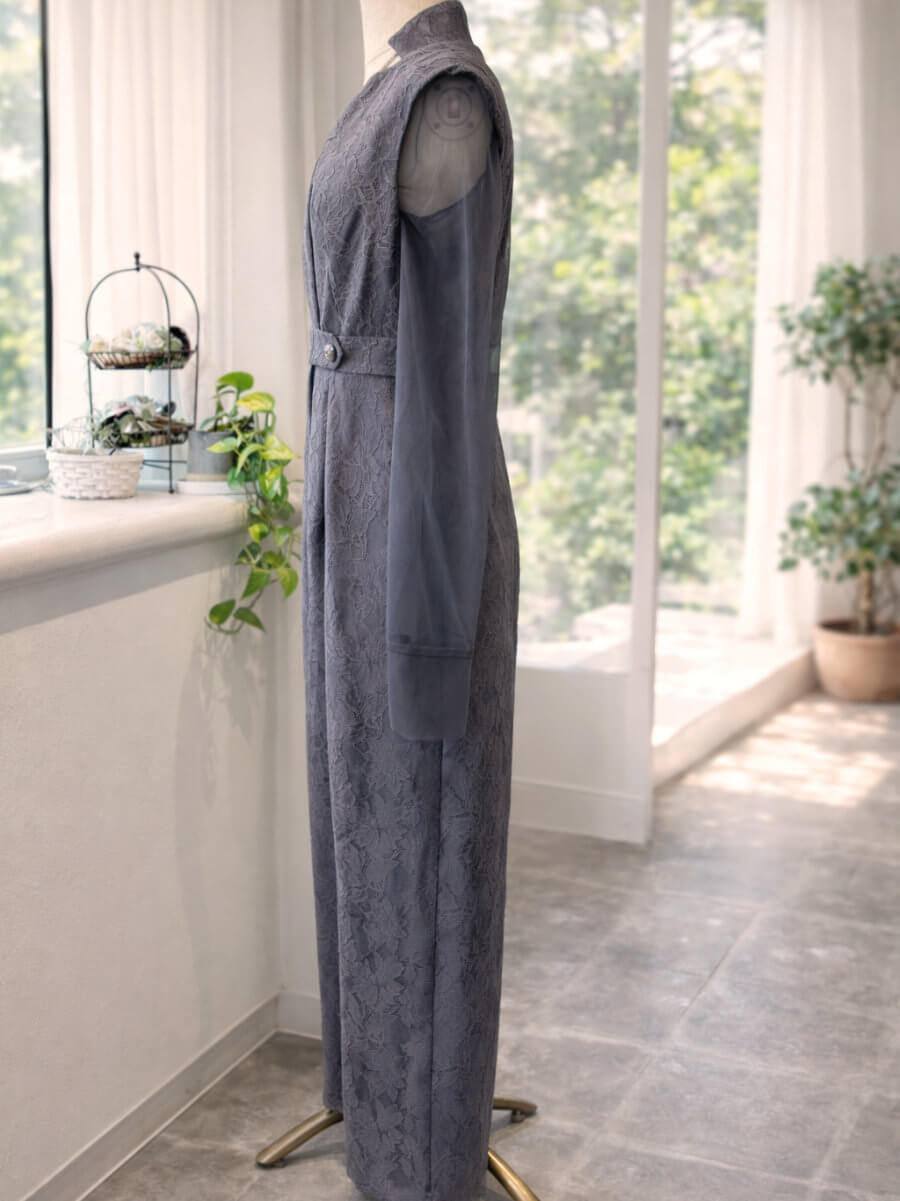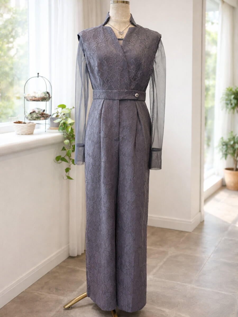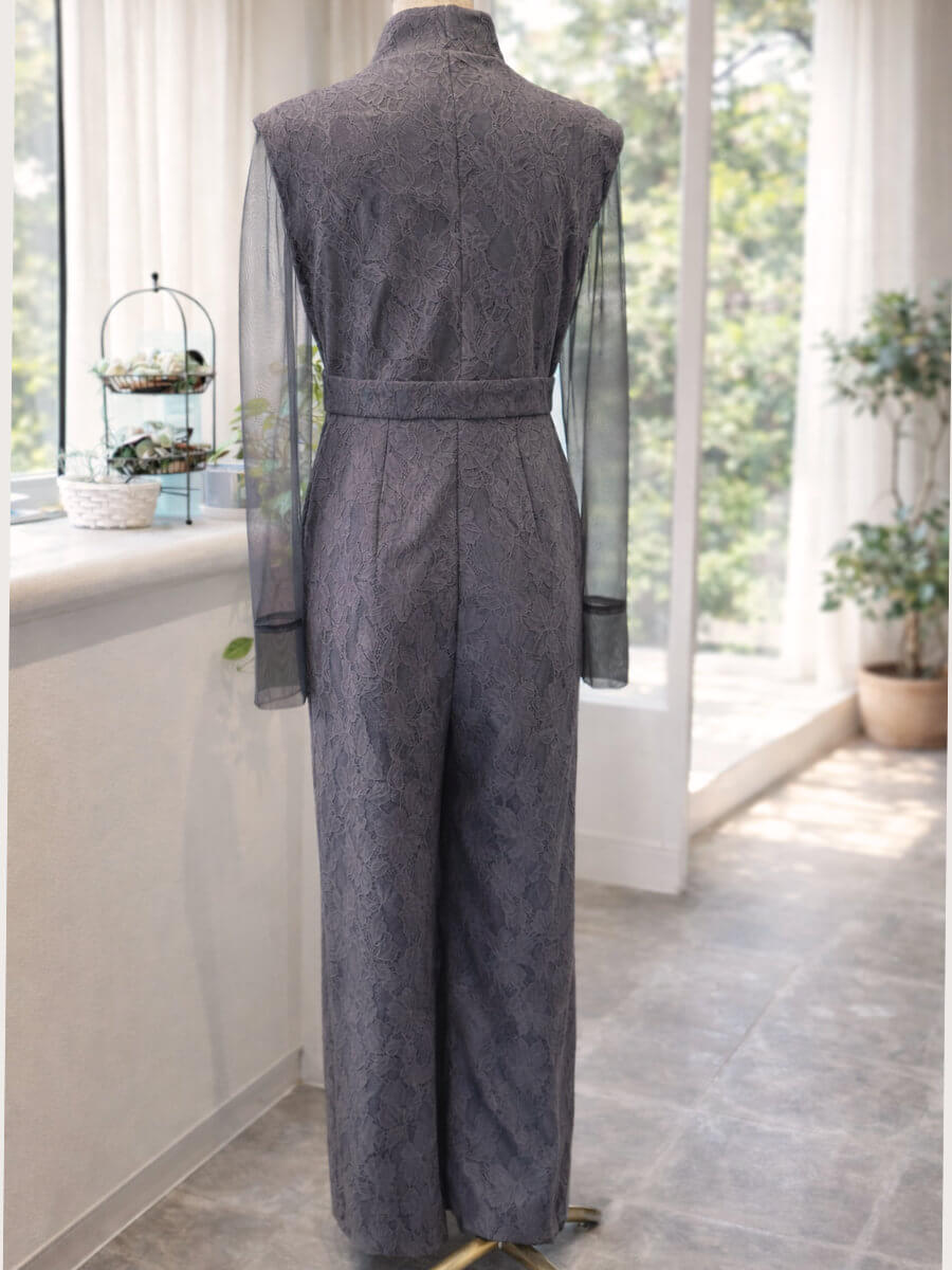 ◇商品について:グレーシアーのインナーとオールインワンパンツのセットアップです。前ボタンとチャックにすることでオールインワンパンツドレスの脱着問題を解決。ボンディング加工を施した張りのあるレースで高級感のある仕上がりになっています。個性的なネックラインと抜け感がクールでモードな印象に。うれしいポケット付きのパンツで、スマホなどとりあえず今しまいたいものなどがスルッと収納できます。