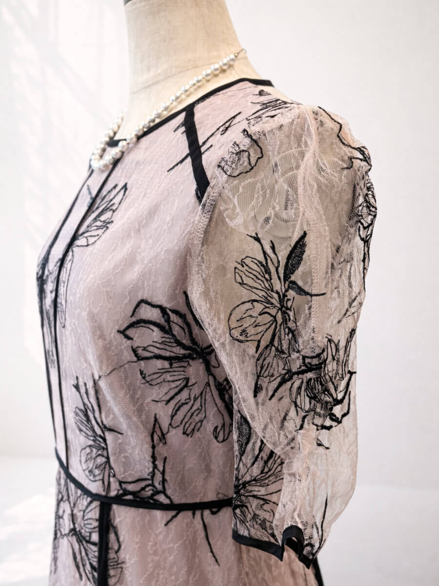 ◇商品について:サテン生地のインナーにピンクのレースがレイヤード。刺繍にはブラックとシルバーのラメ糸が施されており程よく輝きを放ちます。ウエスト部分はリボンで調整が可能です。繊細なレースで上品さがあります。スカートの裾部分はフレアになっていてふわりと揺れるドレスです。カシュクールの袖で二の腕をうまくカバーされます。フロント部分のデコルテに透け感はありませんが後ろの方部分はレースで透け感がありますので下着にはお気を付けください。