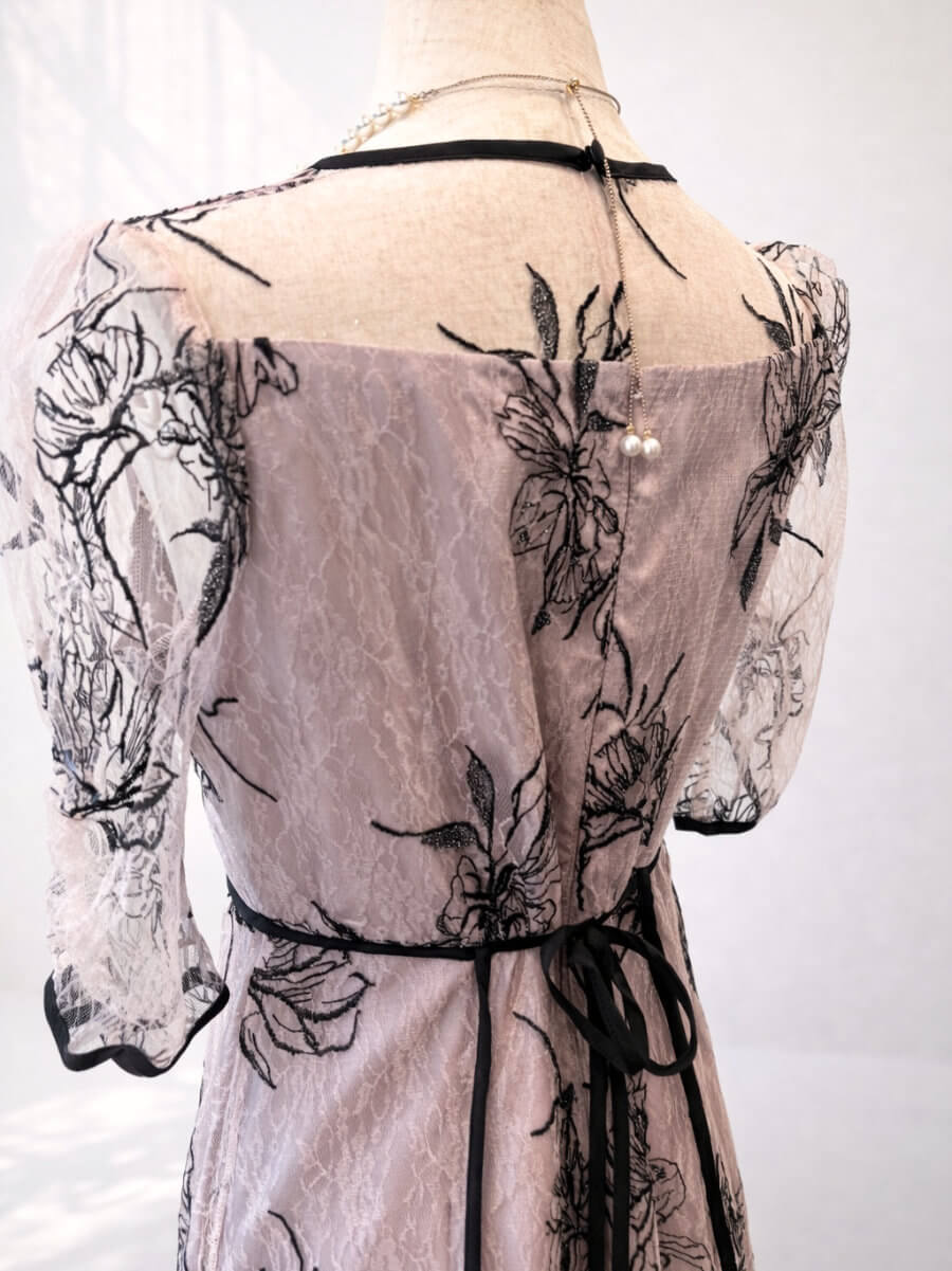 ◇商品について:サテン生地のインナーにピンクのレースがレイヤード。刺繍にはブラックとシルバーのラメ糸が施されており程よく輝きを放ちます。ウエスト部分はリボンで調整が可能です。繊細なレースで上品さがあります。スカートの裾部分はフレアになっていてふわりと揺れるドレスです。カシュクールの袖で二の腕をうまくカバーされます。フロント部分のデコルテに透け感はありませんが後ろの方部分はレースで透け感がありますので下着にはお気を付けください。
