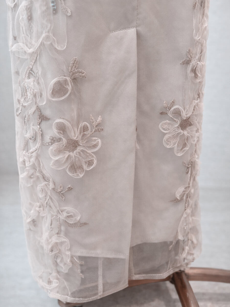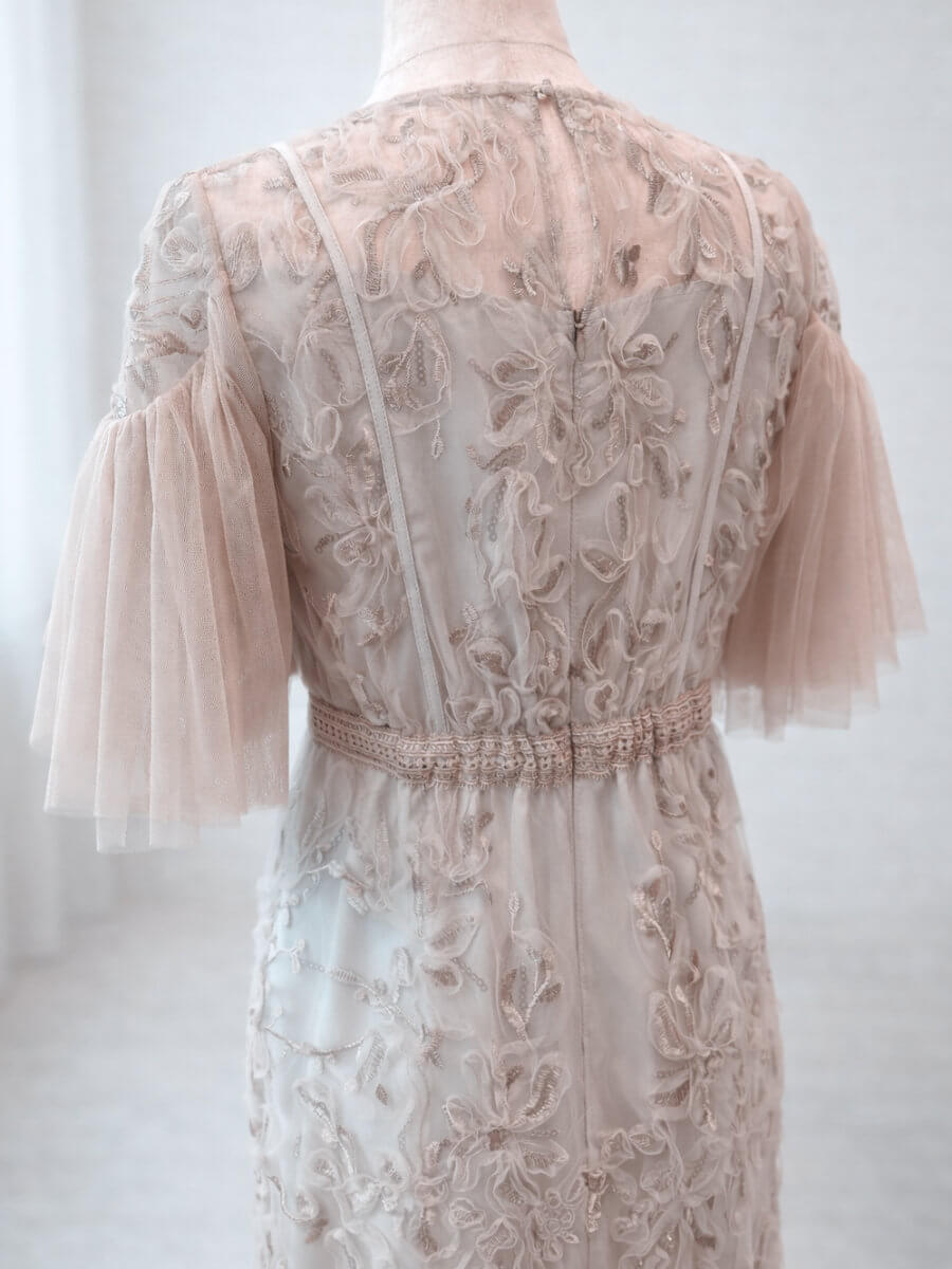 繊細なフラワー刺繍と立体感のあるレースが全体にあしらわれています。ドレスカラーと同じスパンコールが動く度に輝きます。ほんのり透け感のあるチュールスリーブは気になる二の腕をカバーし軽やかな印象に。うれしいポケット付きです。ウエスト部分の切り返しなどメリハリは忘れず柔らかさのあるシルエット。くるみボタンひとつひとつにも生地をレイヤードしており、こだわりの一着です。落ち着いたニュアンスカラーで結婚式だけでなく、成人式パーティ、謝恩会、女子会、お食事会など幅広いシーンでご着用頂けます。