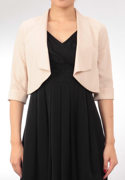 ◇ピンクベージュ系の優しいお色味 ◇ジャケットボレロなのでフォーマルなシーンにおすすめです。袖口は折り返してもそのままでもどちらでもご着用頂けます。 ◇サイズはMサイズ